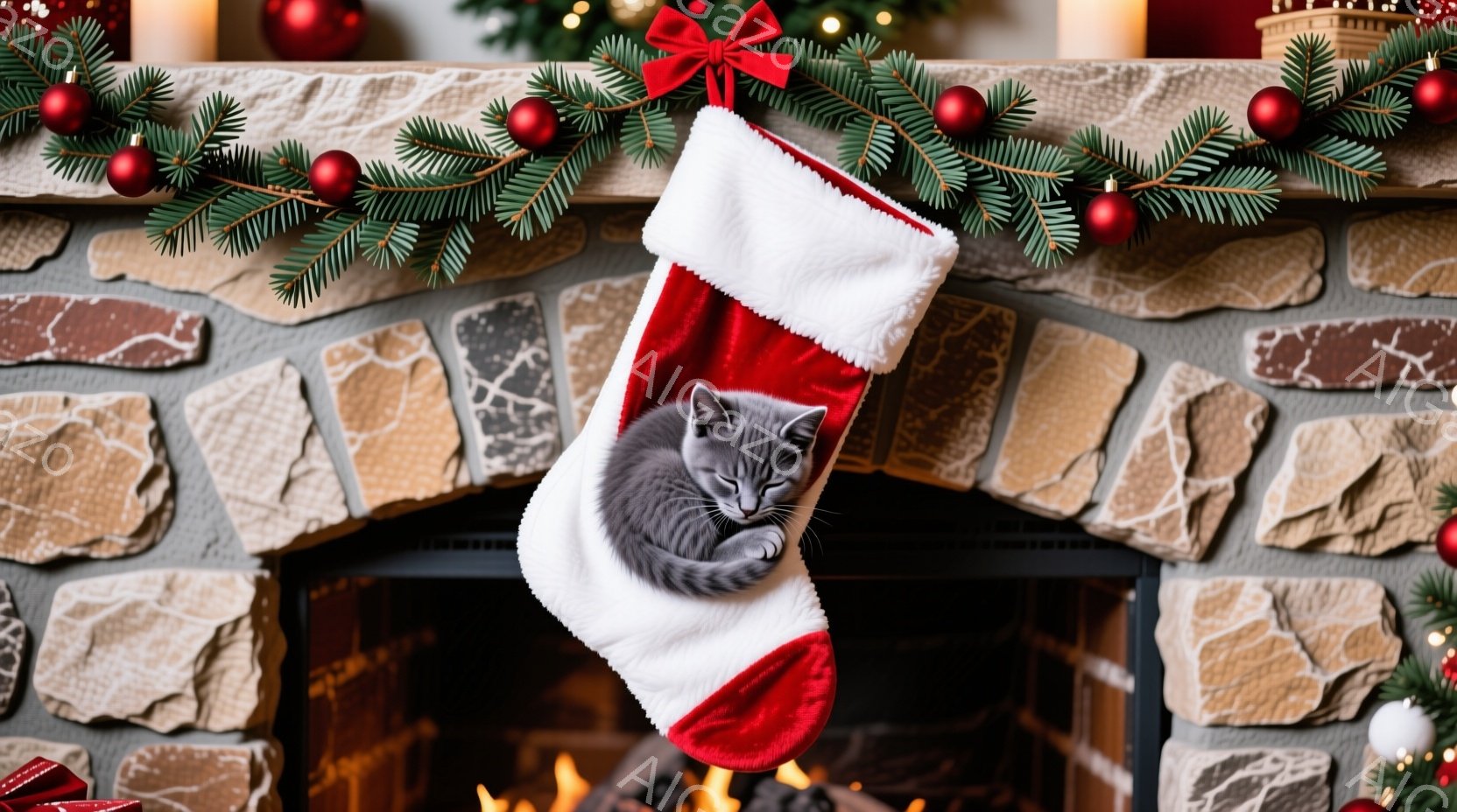 暖炉のそばに吊るされた赤いクリスマスストッキングの中に、グレーの猫が丸まって眠っています。ストッキングは白い毛皮で縁取られており、緑色のクリスマスツリーの飾りと赤いリボンで飾られた暖炉の上に掛けられています。暖炉の中の炎が暖かく、心地よい雰囲気を作り出しています。