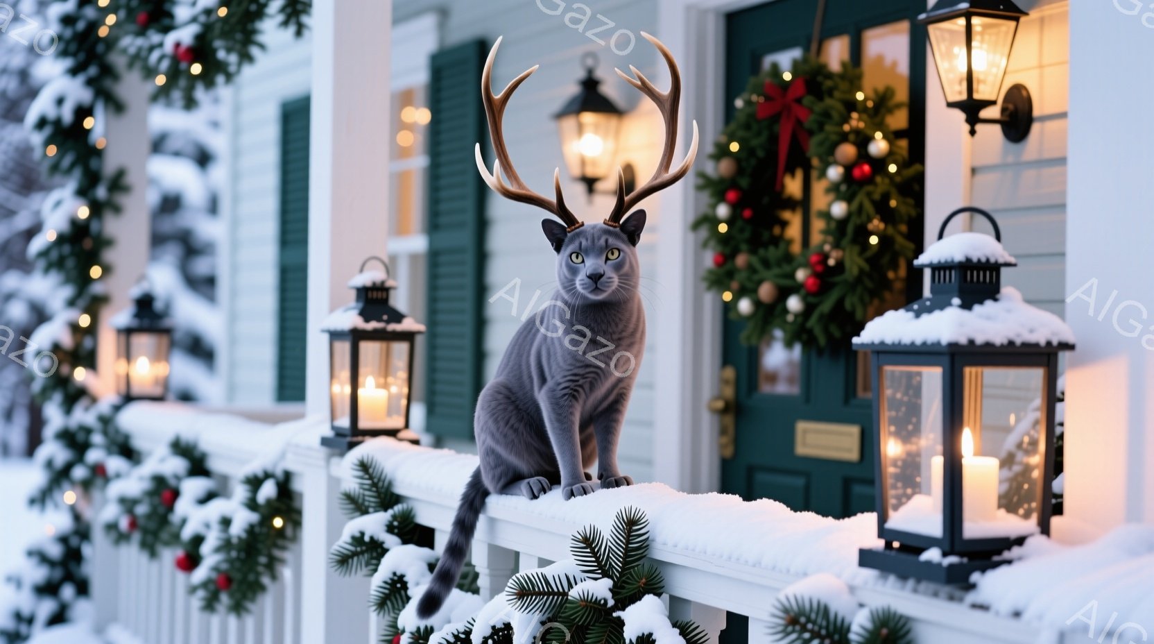 白い手すり上に灰色の猫が座っており、頭には角が生えているように見えます。背景にはクリスマス装飾の施された家があり、つる草のリースや点灯されたランタンが冬の暖かさを演出しています。雪が積もり、クリスマスの装飾と猫のユニークな姿が幻想的な雰囲気を醸し出しています。