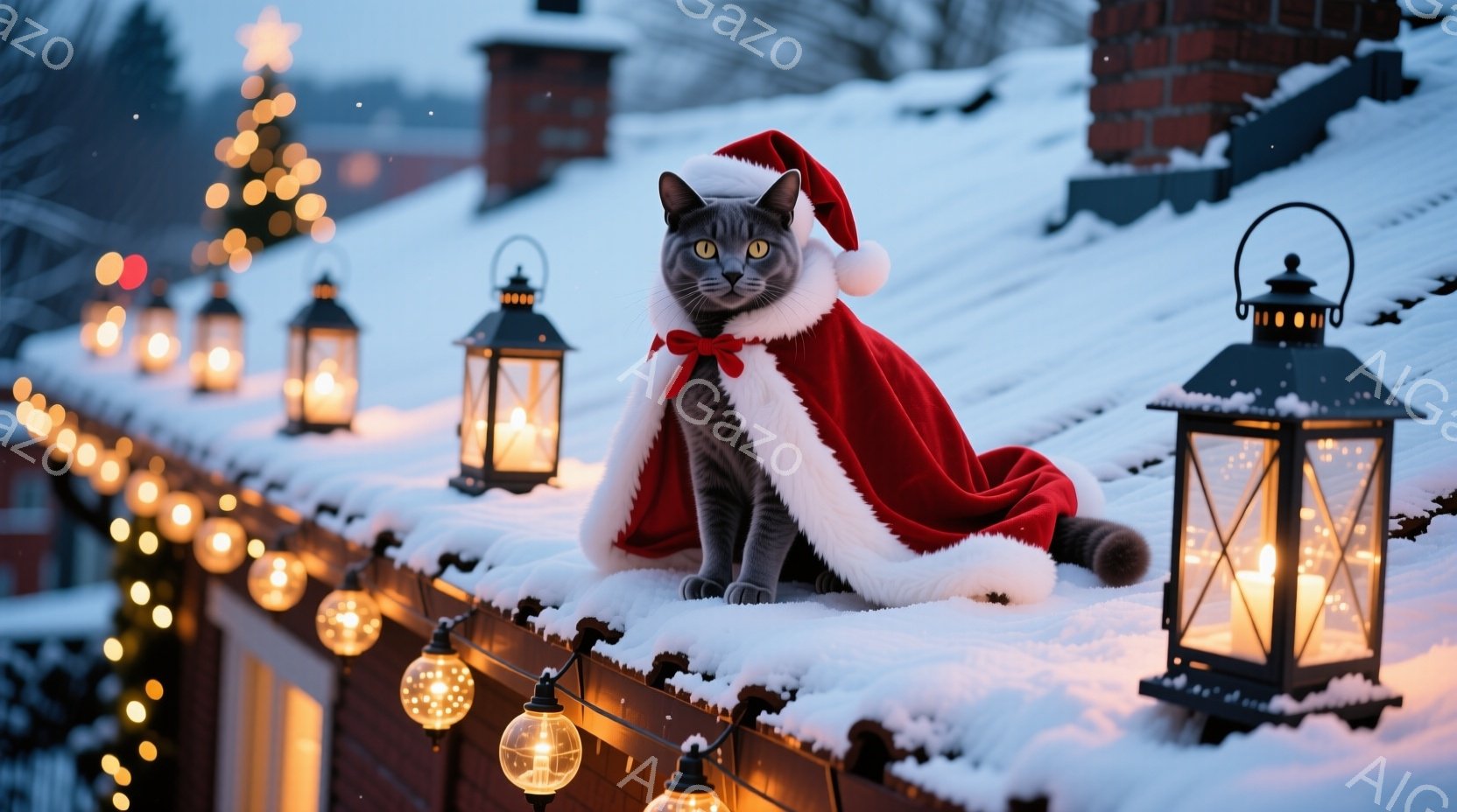 灰色の猫がサンタクロースの帽子と赤いマントを着て、雪で覆われた屋根の上で座っています。背景には、ぼんやりと見える建物と、点灯したキャンドルと電球で飾られた屋根があり、冬の暖かい雰囲気を醸し出しています。猫は正面をまっすぐ見ており、落ち着いた表情で冬の景色を眺めているようです。