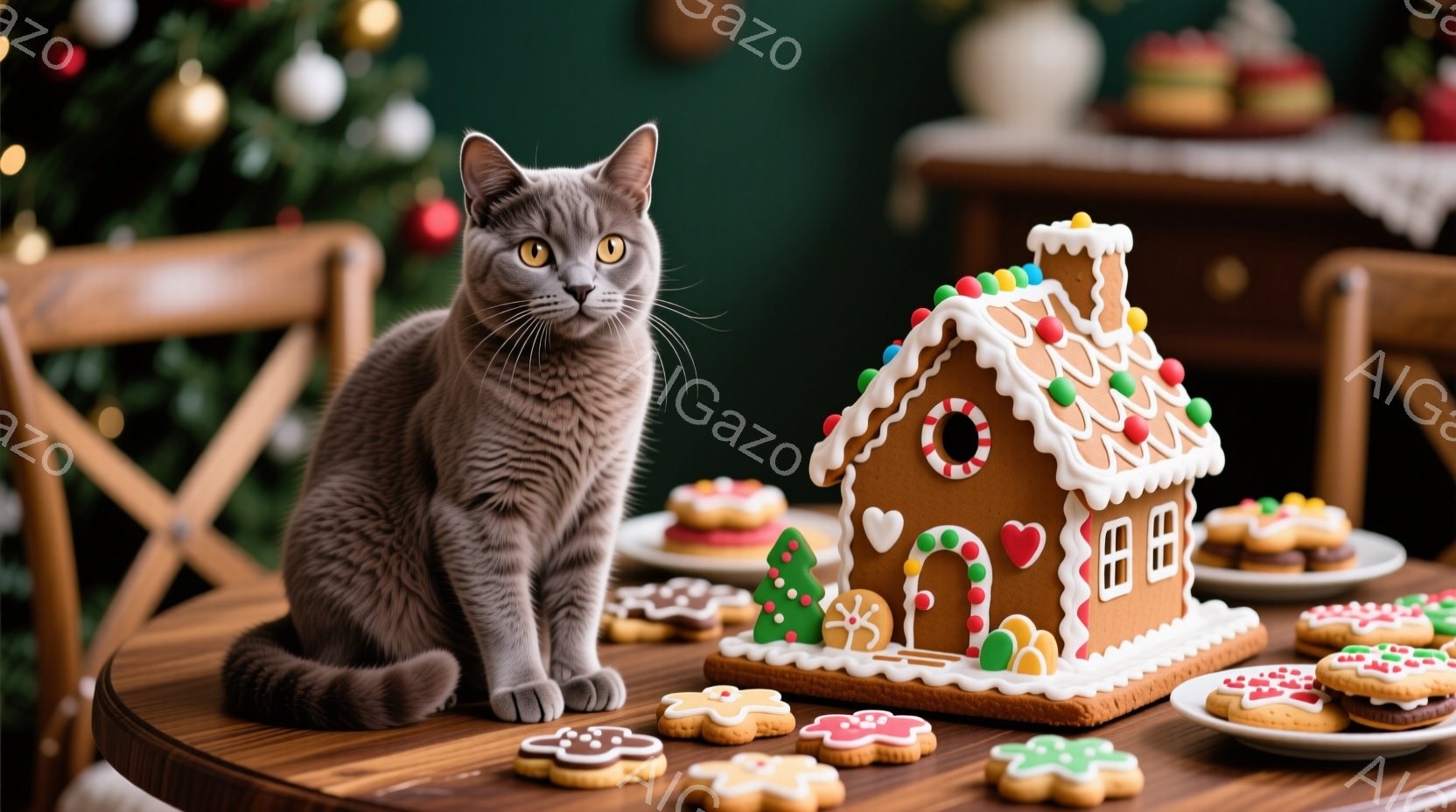 テーブルの上には、丁寧に作られたジンジャーブレッドハウスと色とりどりのクッキーが並べられています。灰色の毛並みの猫がジンジャーブレッドハウスのそばで座り、少し上目遣いでこちらを見ています。背景にはクリスマスツリーがぼんやりと見え、温かく、お祝いムードに満ちた雰囲気です。