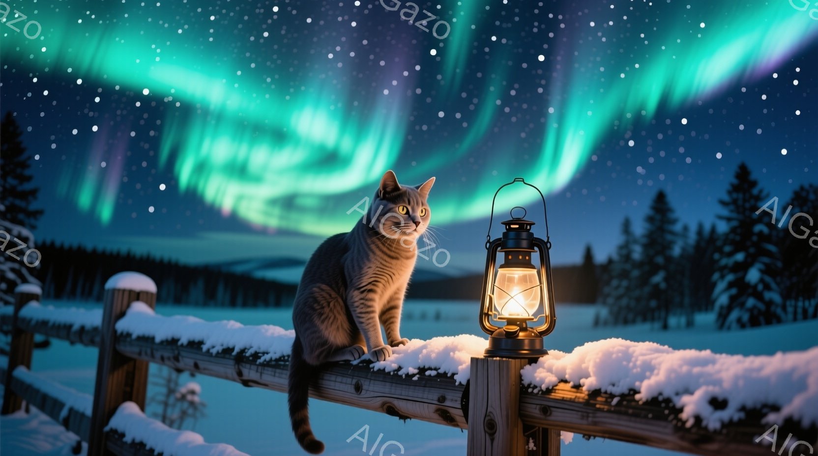 灰色の毛並みの猫が雪に覆われた木の柵の上で座っており、背後には明るいランタンが置かれている。背景には深い青色の夜空にオーロラが広がり、遠くには暗いシルエットの木々が連なっている。全体的に、静かで神秘的な冬の夜の雰囲気が漂っている。