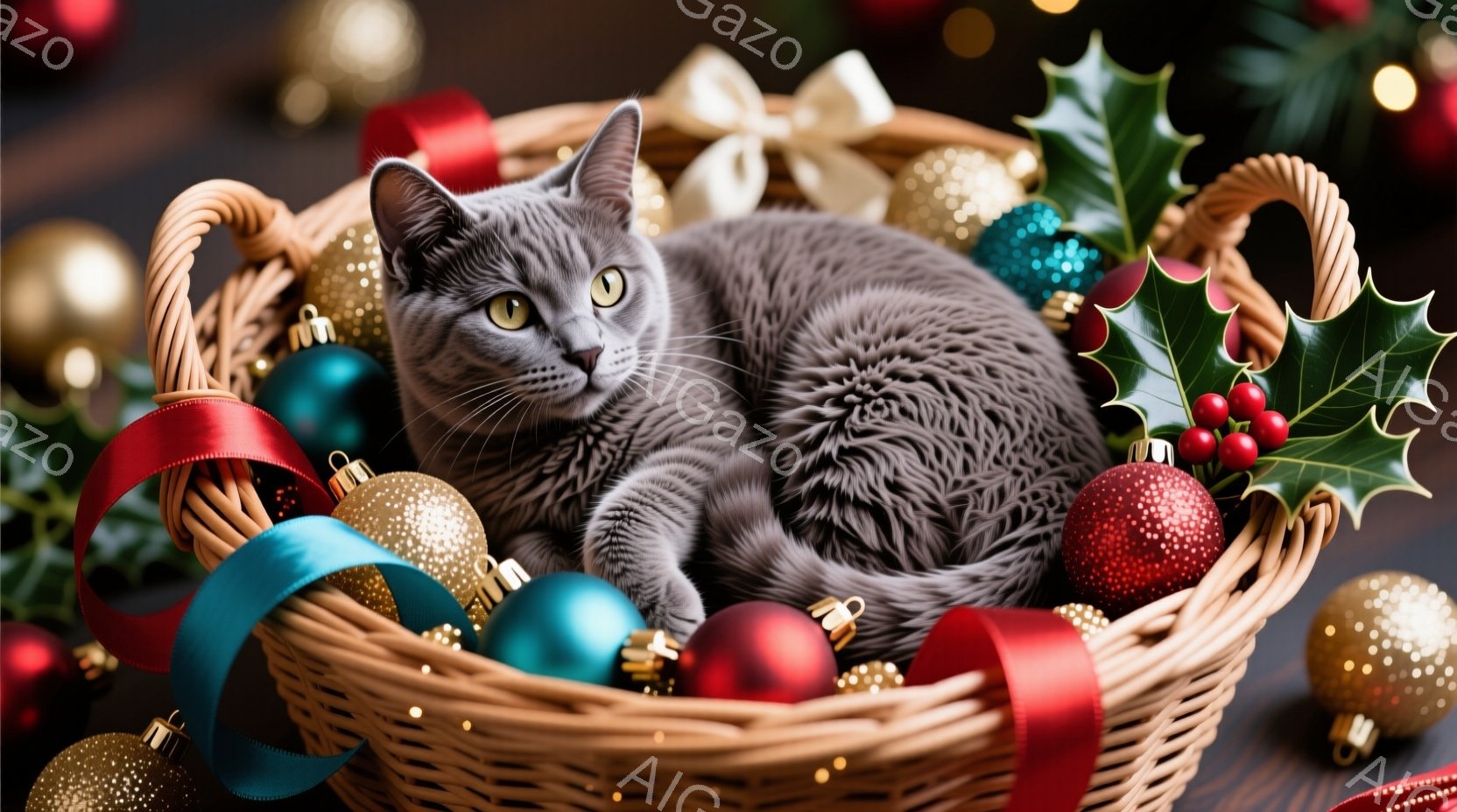 籠の中に灰色の猫が丸まって眠っている様子が描かれている。籠の周りには、赤、緑、金色のクリスマスオーナメントやリボンが散りばめられており、背景にはぼやけたクリスマスツリーの光が灯っている。全体的に温かく、穏やかな祝祭の雰囲気が漂っている。