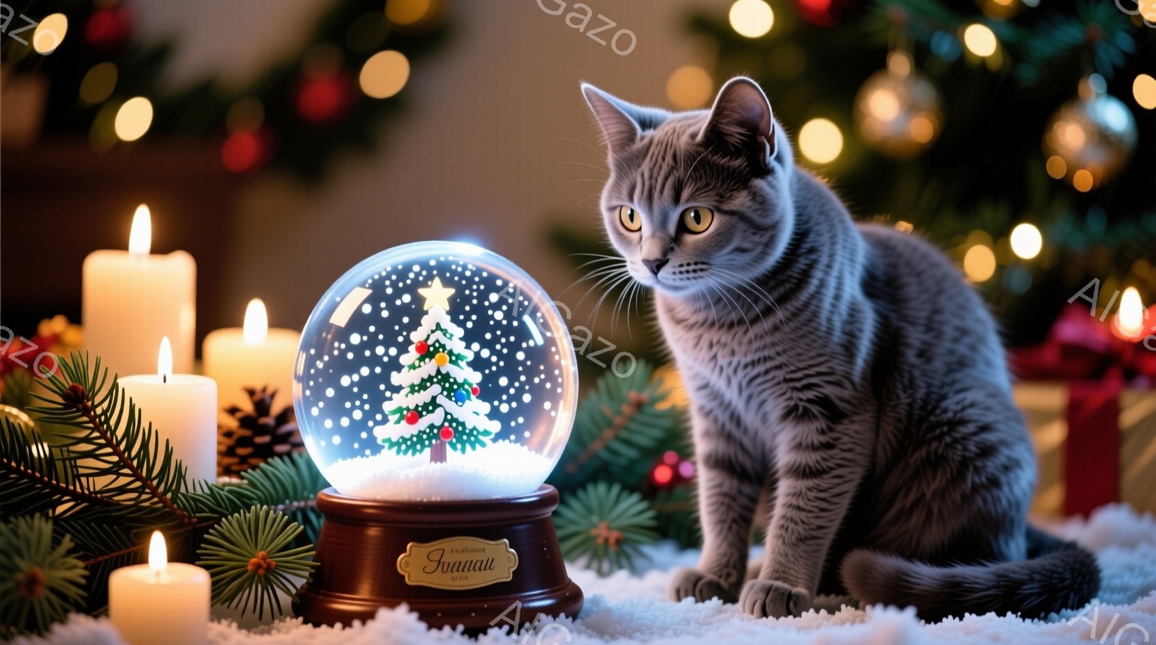 灰色の猫が、雪の降るクリスマスの背景の中で、キラキラと輝くスノーグローブを見つめています。背景にはクリスマスツリーやキャンドルが配置され、雪の敷かれた地面が冬の雰囲気を高めています。猫は少し緊張した表情で、スノーグローブに集中しており、暖かく穏やかなクリスマスの雰囲気が漂っています。