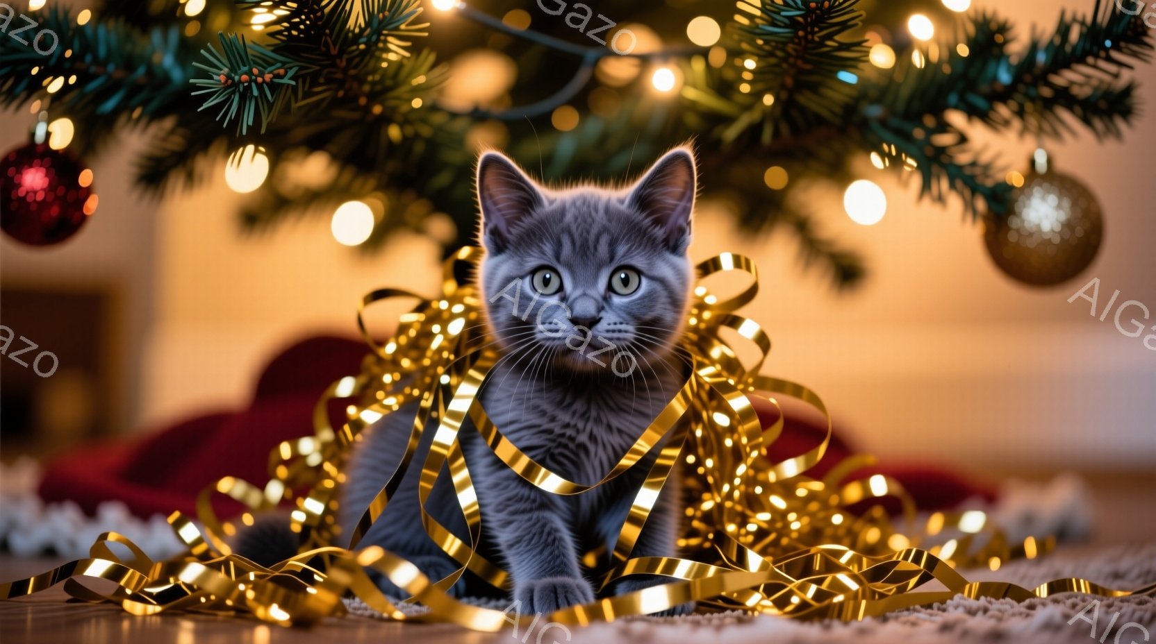 灰色の猫が、クリスマスツリーの足元に広がる金色のリボンに囲まれて横たわっています。猫は前足を重ね、まっすぐカメラを見つめており、その表情はリラックスしていて少しいたずらっぽいです。背景にはぼんやりとクリスマスツリーの緑と電飾の光が映り込み、温かくお祝いムードに包まれています。