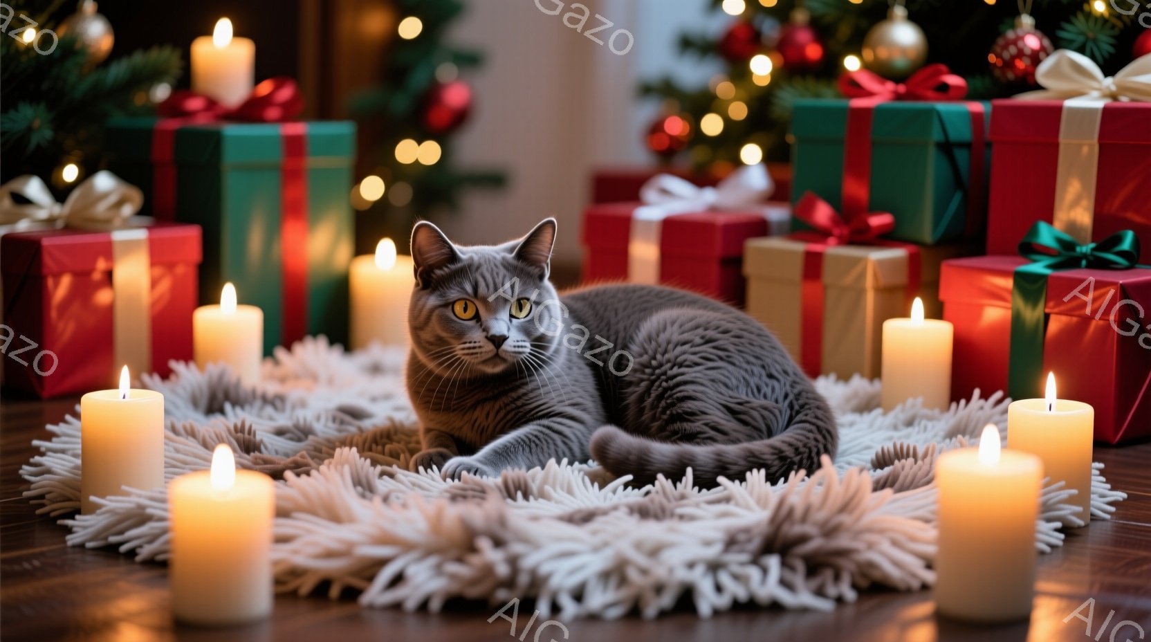 灰色がかった毛並みの猫が、ふわふわとした白いラグの上に優雅に横たわっています。周りには温かい光を放つキャンドルが並べられ、背景にはクリスマスツリーとラッピングされたプレゼントが積み上げられています。暖かく穏やかな雰囲気が漂い、クリスマスの優しい光景が目に浮かびます。
