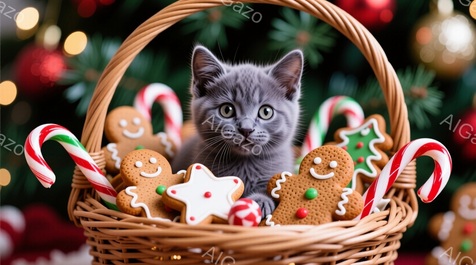 籐編みのバスケットの中に、灰色の毛並みの小さな子猫が丸まって座っています。バスケットには、ジンジャーブレッドクッキーと赤と白のキャンディケーンが飾られており、背景にはぼやけたクリスマスツリーの光が輝いています。全体的に、暖かく、お祝いムードにあふれた可愛らしい光景です。