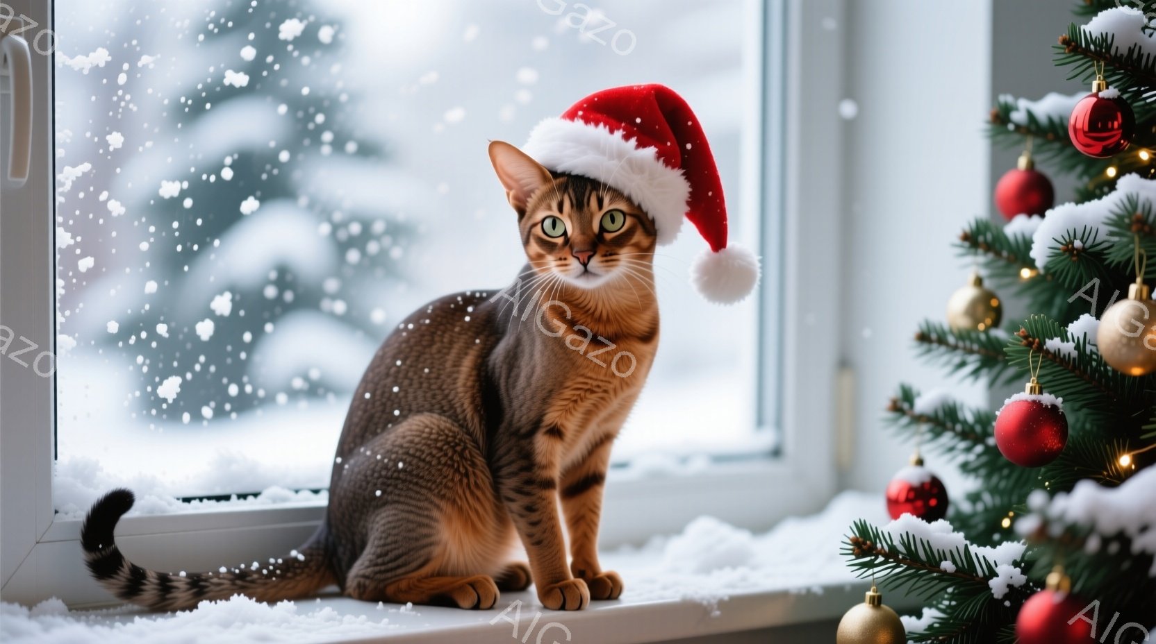 窓辺に座ったオレンジ色のトラ柄の猫が、赤いサンタ帽を被ってこちらを見ている。雪が降る外の景色が見え、室内にはクリスマスツリーが飾られ、暖かく穏やかな雰囲気が漂っている。猫の表情は少し警戒しているようにも見えるが、全体的にリラックスした様子がうかがえる。