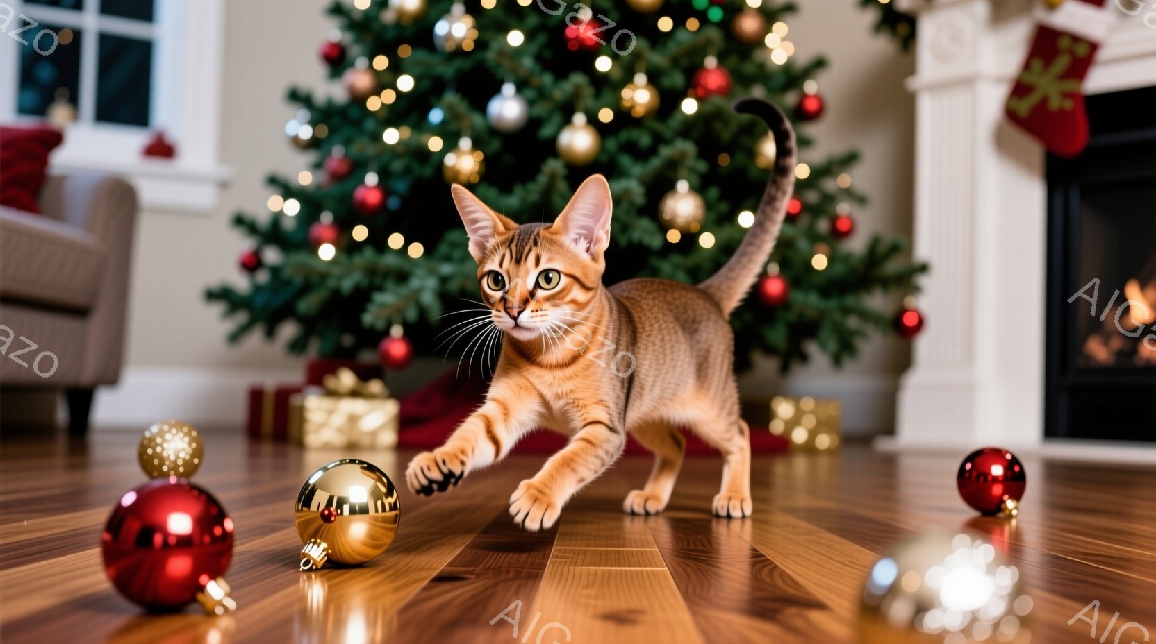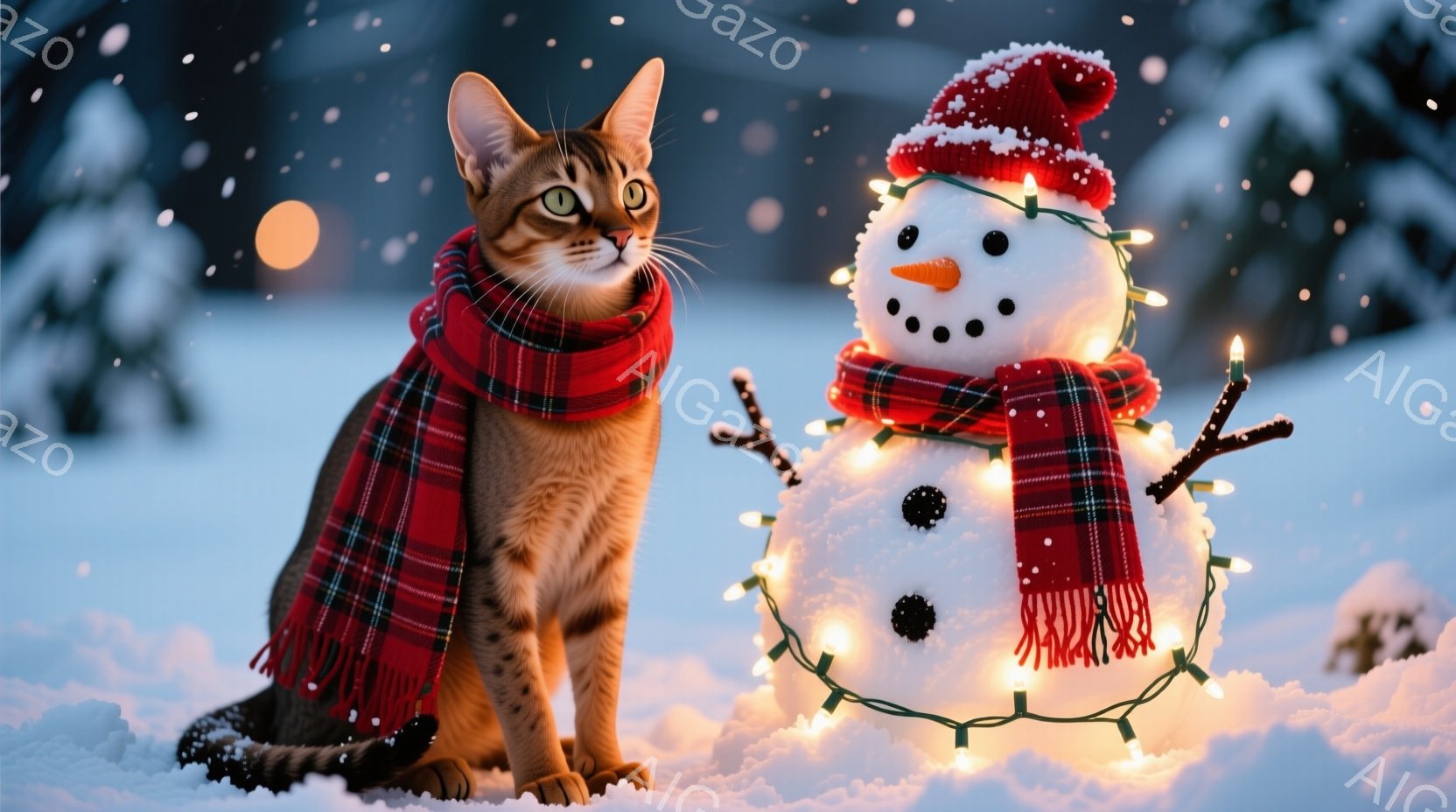 雪景色の中に、スコティッシュフォールドの子猫が赤いチェックのショールで首を温め、雪だるまと共に座っている。雪だるまはシルクハットをかぶり、枝の腕と小さな石の目、にんじんの鼻を持つ。背景にはぼやけた木々が見え、光る電飾が雪の上に暖かな光を添えている。