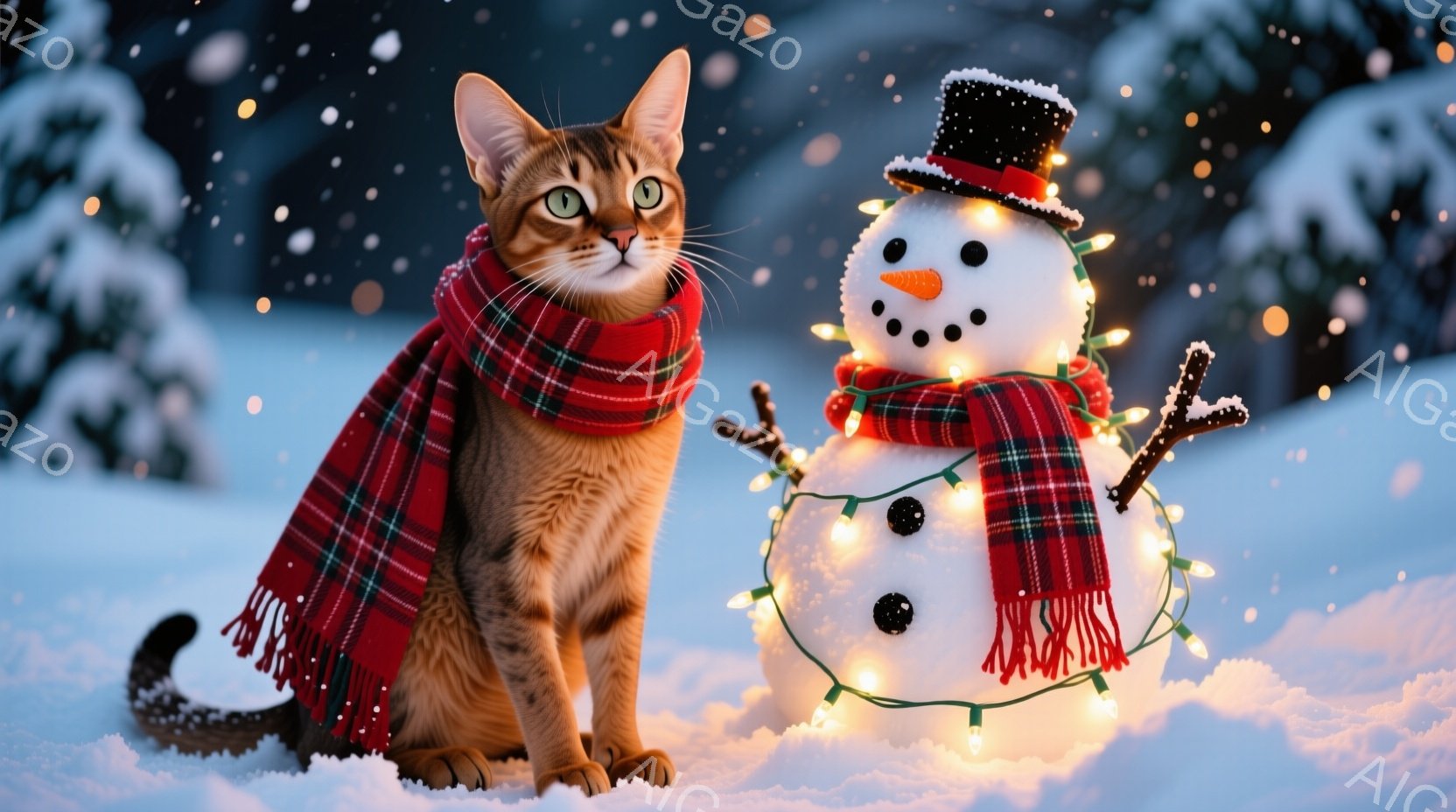 茶色の縞模様の猫が雪の上に座っており、首には赤いチェック柄のマフラーが巻かれています。猫は前方をまっすぐ見つめ、リラックスした表情をしています。背景には雪景色が広がり、小さな光が輝き、雪だるまがライトで飾られており、冬の暖かく心地よい雰囲気を醸し出しています。
