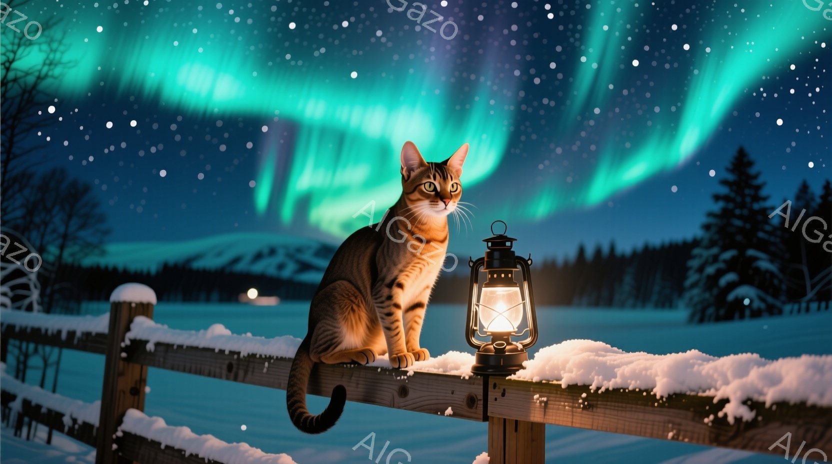 雪に覆われた木の柵の上に、茶色の縞模様の猫が座っています。猫は前方をまっすぐ見つめ、警戒心と好奇心を湛えた表情をしています。背景には、オーロラが輝き、遠くに雪に覆われた建物と木々が見え、幻想的で静謐な冬の夜の雰囲気を醸し出しています。