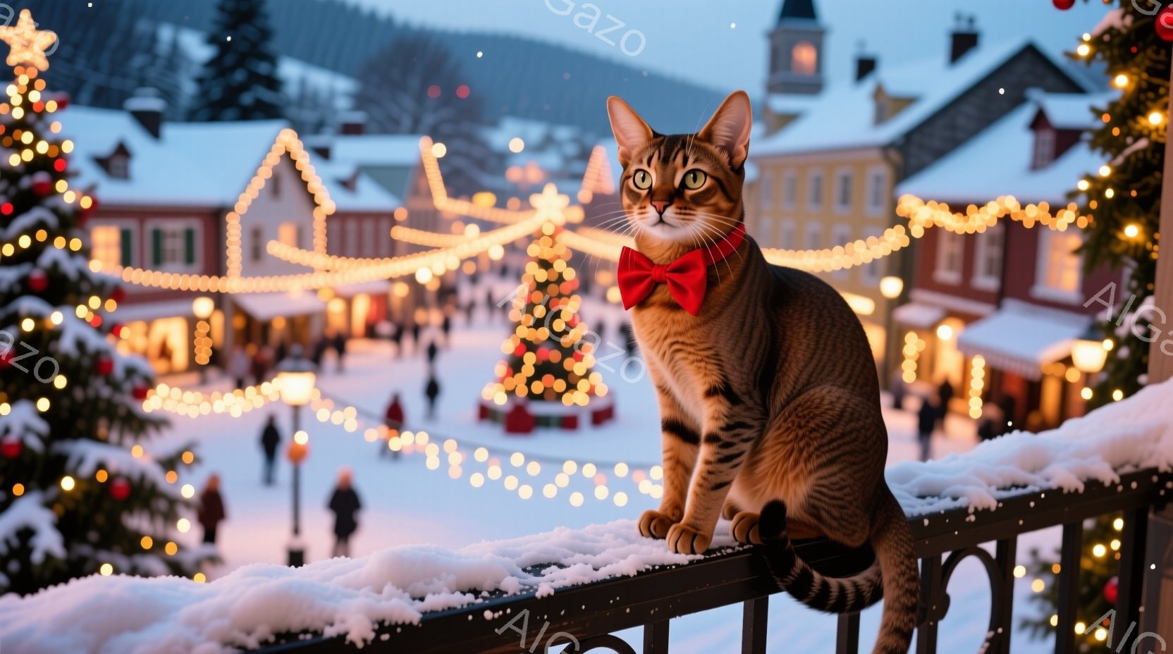 茶トラ猫が雪で覆われた手すりに座り、赤い蝶ネクタイをつけてカメラを見つめている。背景には、クリスマスツリーやイルミネーションで飾られた雪景色の中に建物が並び、人々が歩いているのが見える。全体的に、暖かく、お祝いムードに満ちた冬の風景が表現されている。