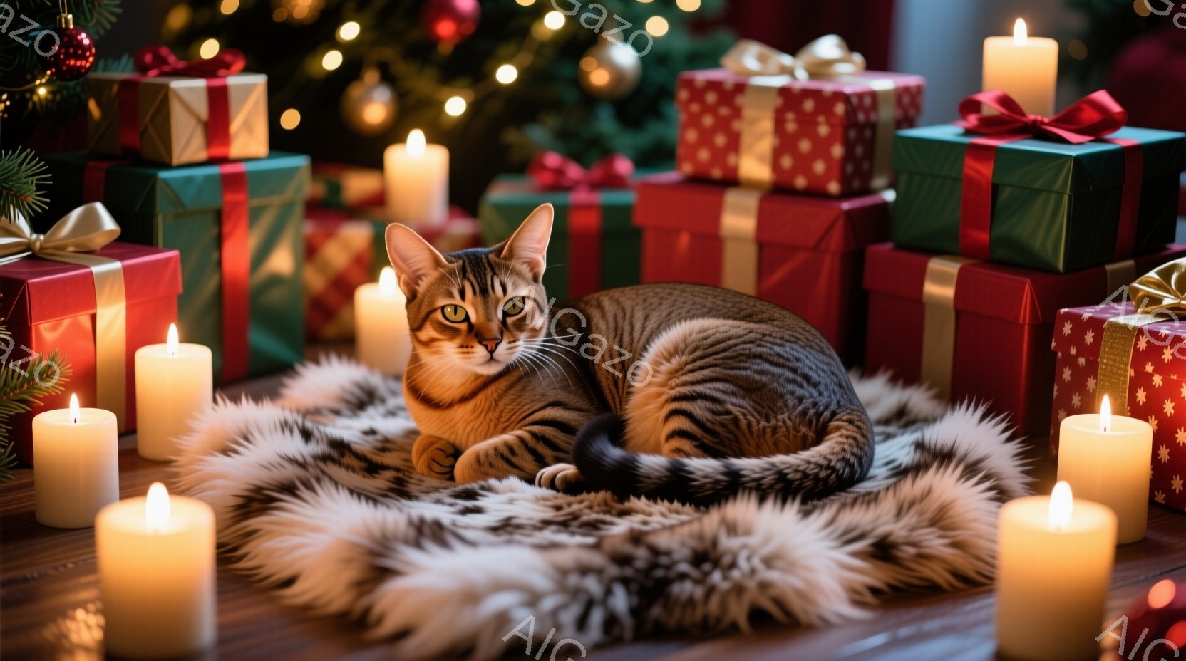縞模様の猫がふわふわの毛布の上に横たわり、リラックスした表情でこちらを見ている。背景には、カラフルな包装紙で飾られたクリスマスプレゼントの山と、灯されたキャンドルが暖かく輝いている。全体的に、穏やかで温かい、クリスマスの雰囲気が漂う場面である。