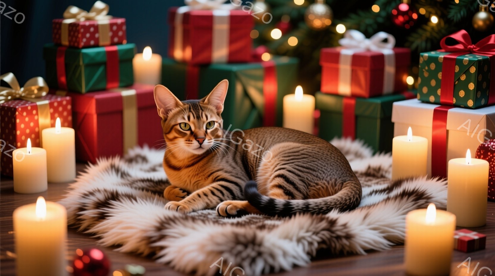 縞模様の猫がふわふわの白い敷物の上で丸まって横たわっています。周囲には赤い、緑色、そして金色のリボンで飾られたプレゼントの箱や、灯されたキャンドルが配置されており、背景にはぼやけたクリスマスツリーの飾りが見えます。暖かく、お祝いムードに包まれた、居心地の良い冬の光景です。