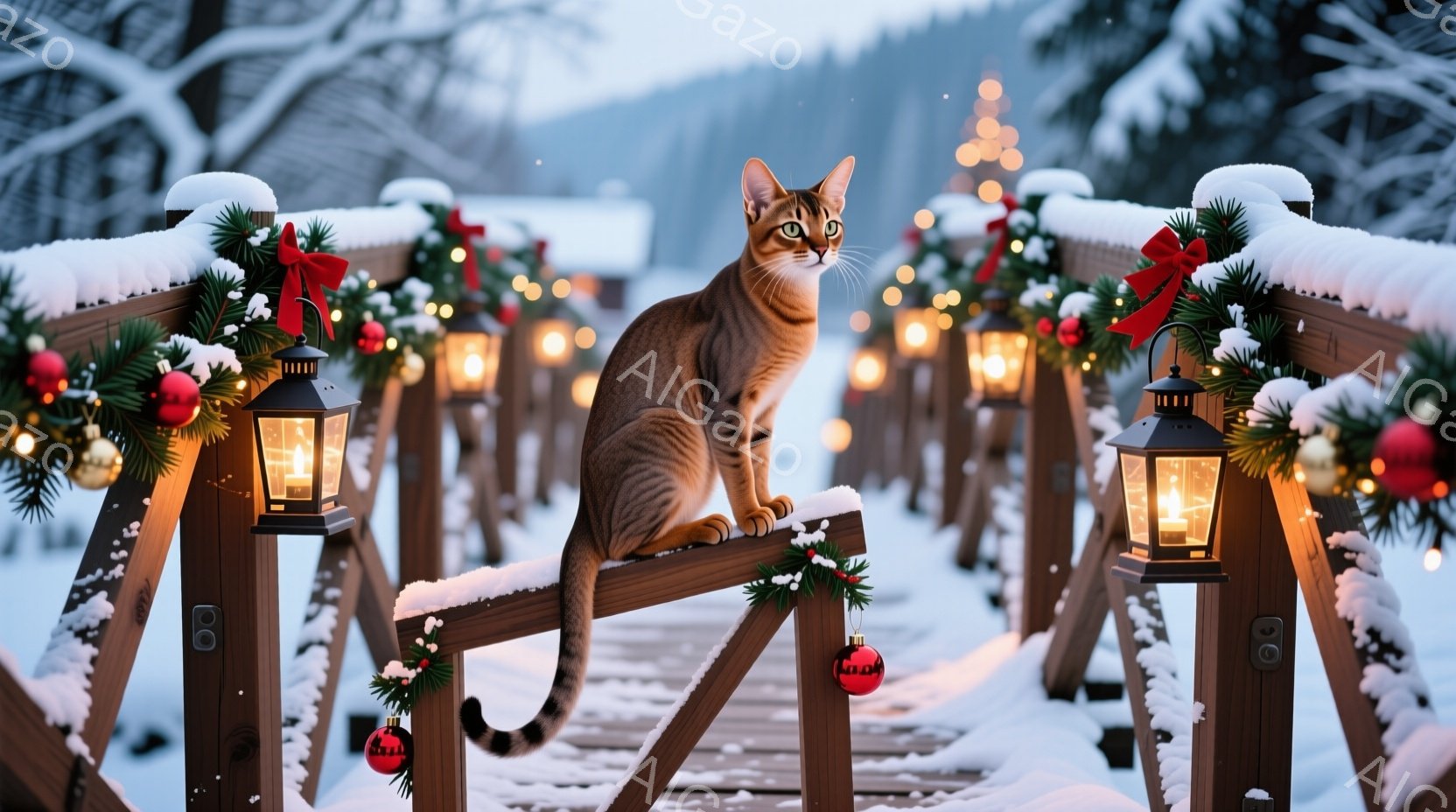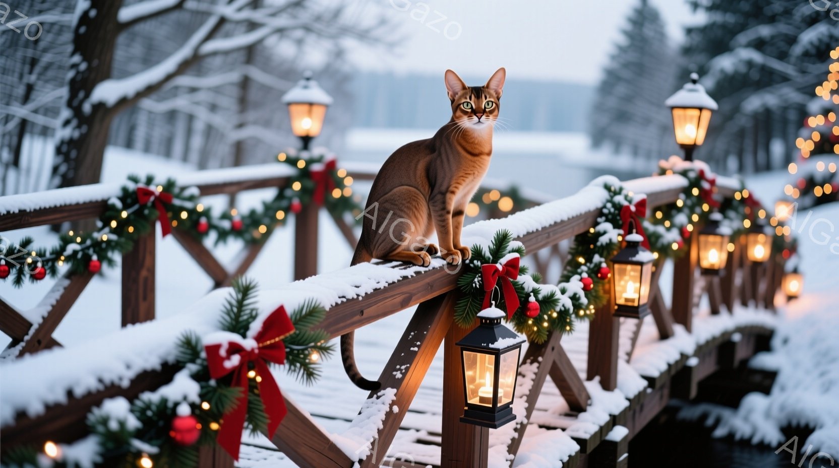 茶色の縞模様の猫が雪に覆われた木製の橋の中央を優雅に歩いている。橋はクリスマス装飾で飾られ、緑のリースと赤いオーナメント、そして点灯されたランタンが冬の風景に暖かさを添えている。背景には雪景色が広がり、穏やかで幻想的な雰囲気を醸し出している。