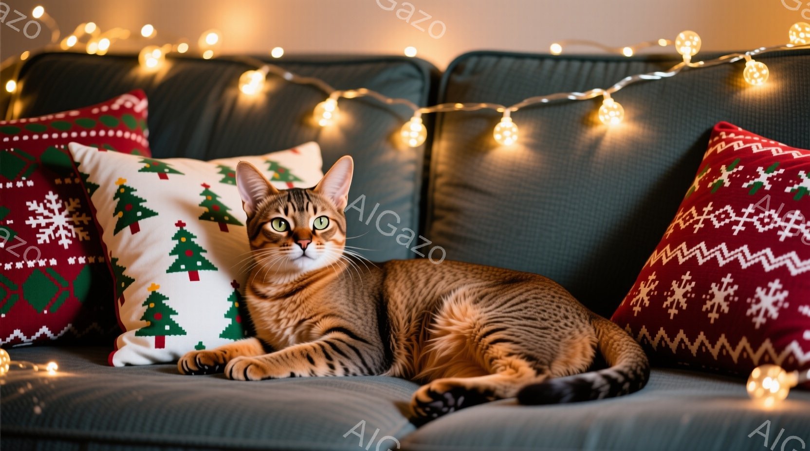 灰色のソファに、縞模様の茶色の猫が横たわっています。猫はリラックスした様子で、正面を見て少し眠たげな表情をしています。背景にはクリスマスの柄のクッションと、温かい光を放つ電飾が散りばめられており、心地よい雰囲気を作り出しています。