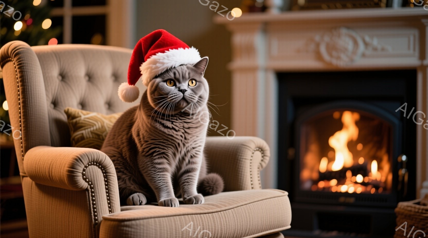 灰色の毛並みの猫が、赤いサンタ帽を被って、クリーム色の肘掛け椅子の座席に座っています。猫は正面を見据え、少し困ったような、または冷静な表情をしています。背景には暖炉があり、炎が燃えており、居心地の良い冬の雰囲気を醸し出しています。