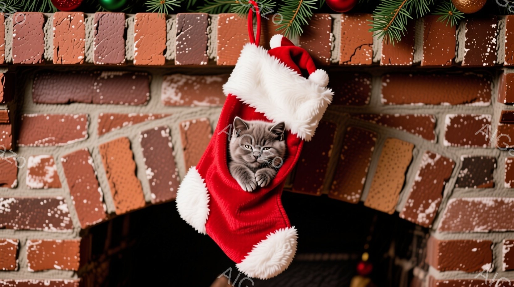 赤いクリスマスストッキングの中に、小さなキジトラの猫が顔を出している。猫は好奇心旺盛そうにこちらを見つめており、丸い瞳が印象的だ。背景はレンガ造りの暖炉で、クリスマスツリーの飾りが見え、温かく楽しい雰囲気を醸し出している。