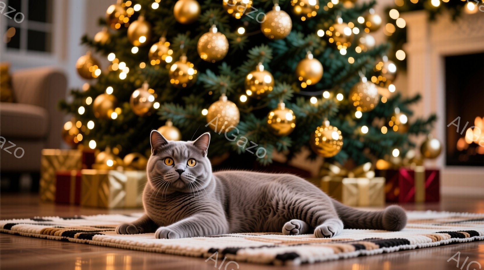 灰色の毛並みの猫が、暖かい色の絨毯の上でリラックスして横たわっています。背景には、金色のオーナメントで飾られたクリスマスツリーと、プレゼントの箱が置かれた暖炉が見え、華やかな祝祭の雰囲気を醸し出しています。猫の表情は穏やかで、心地よい空間でくつろいでいる様子が伝わってきます。