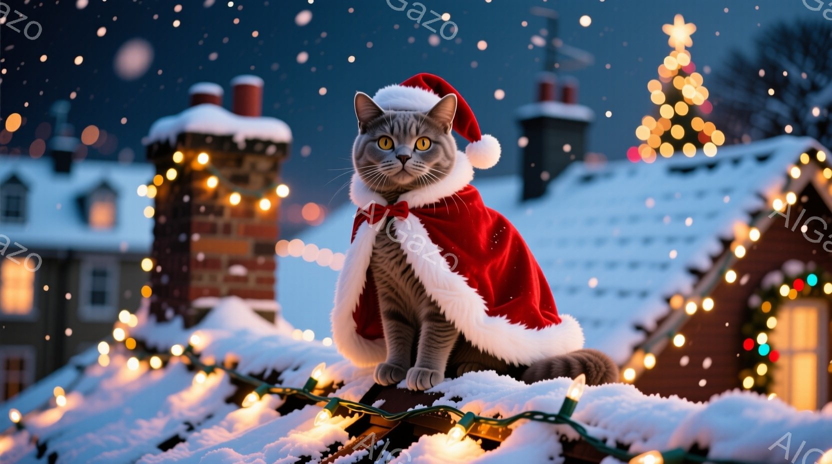 白と灰色の縞模様の猫が、赤いサンタクロースのケープを身につけ、雪の上に座っています。その表情はどこか自信に満ちており、周囲のカラフルなイルミネーションが冬の暖かさを演出しています。背景には、雪に覆われた屋根と、ぼんやりと見える建物があり、クリスマスの楽しい雰囲気が漂っています。