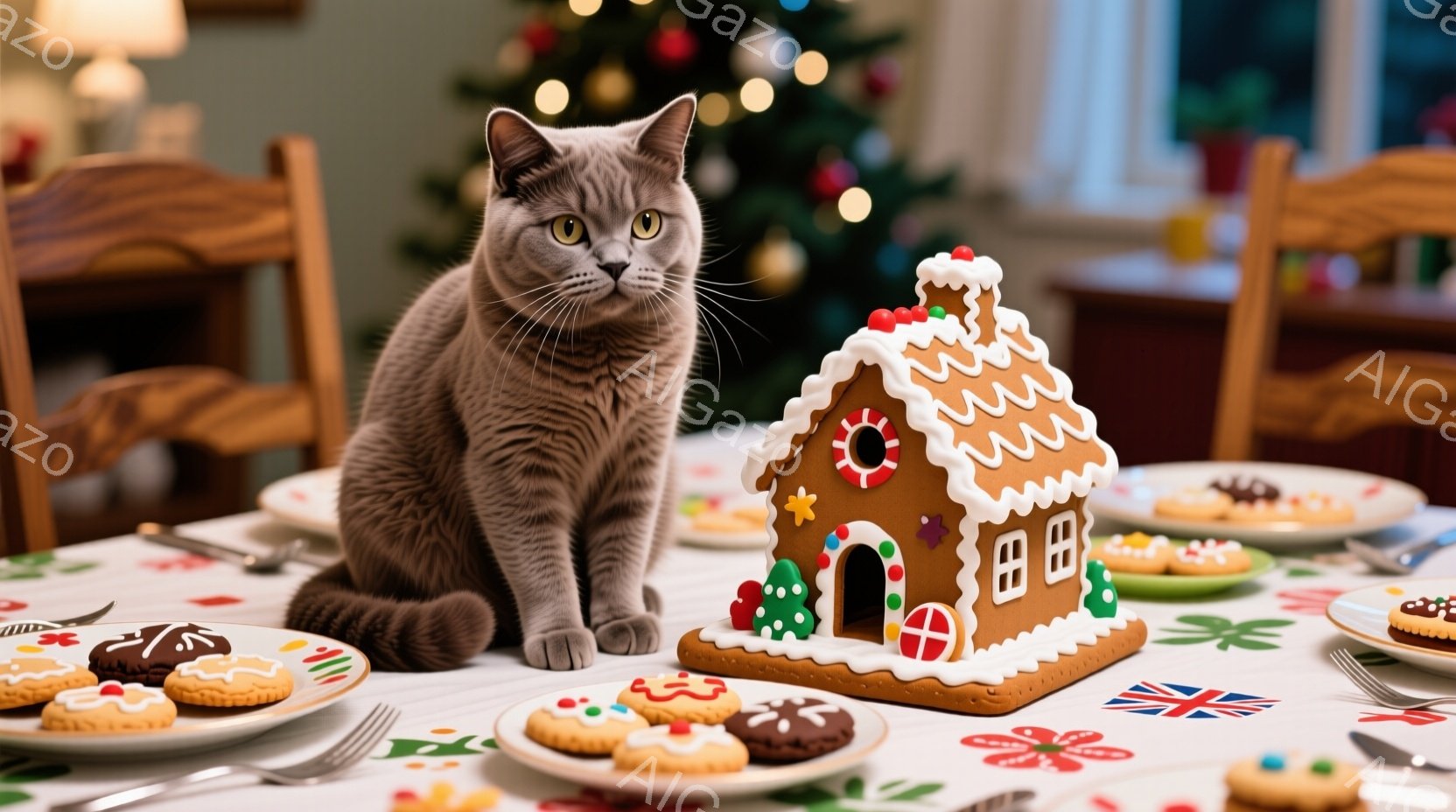 灰色の猫が、首にイギリスの国旗のバンダナを巻いて、ジンジャーブレッドハウスの前に座っています。テーブルの上には、様々な形のジンジャーブレッドクッキーが飾られ、背景にはぼやけたクリスマスツリーと家具が見えます。温かく、お祝いの雰囲気が漂う、可愛らしいシーンです。