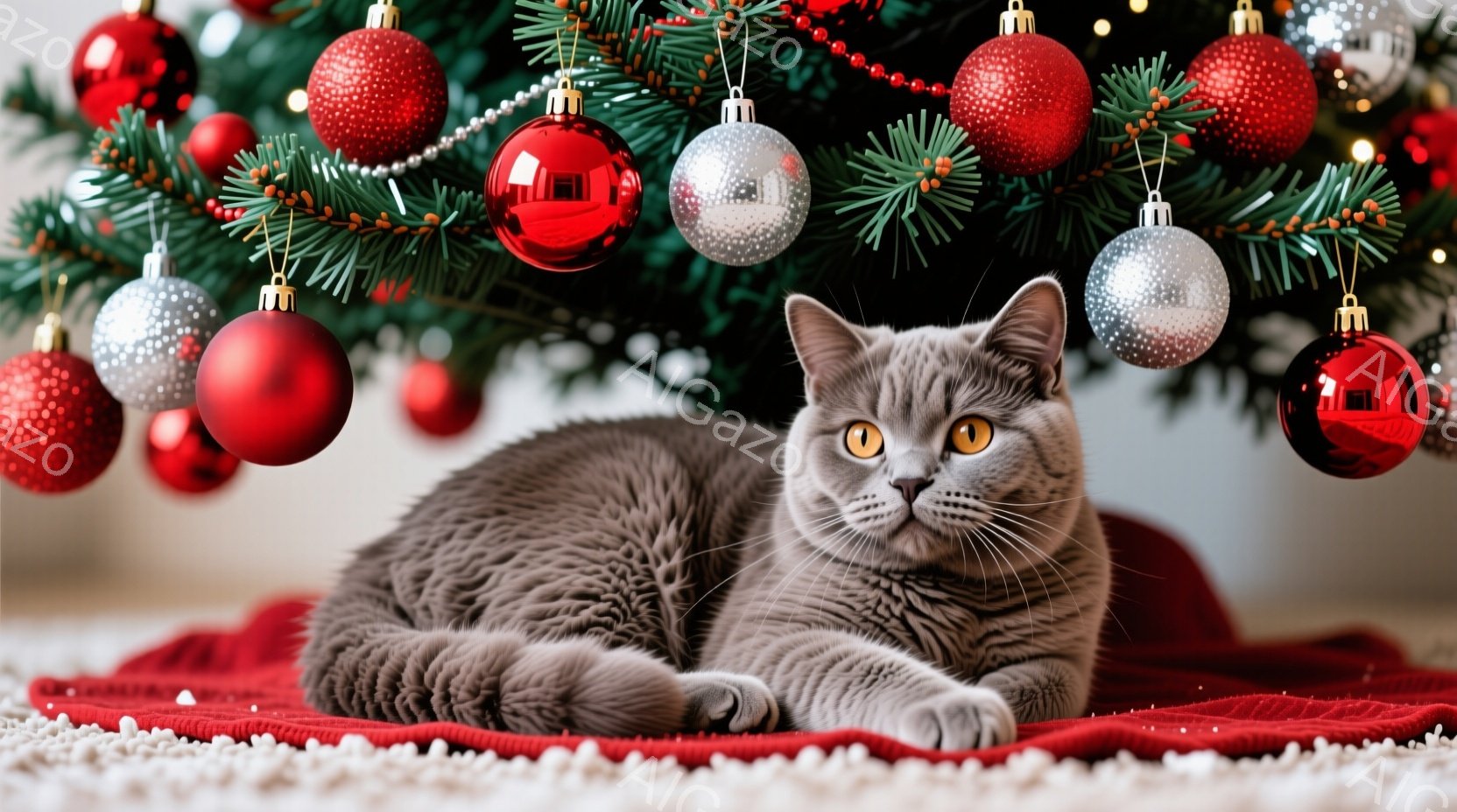 灰色の毛並みの猫が赤い毛布の上に横たわり、穏やかな表情で正面を見つめています。背景には緑のクリスマスツリーが飾り付けられており、赤いオーナメントが散りばめられています。暖かく、穏やかで、祝祭的な雰囲気が漂う、冬のシーンです。