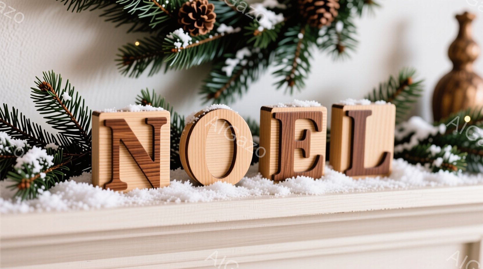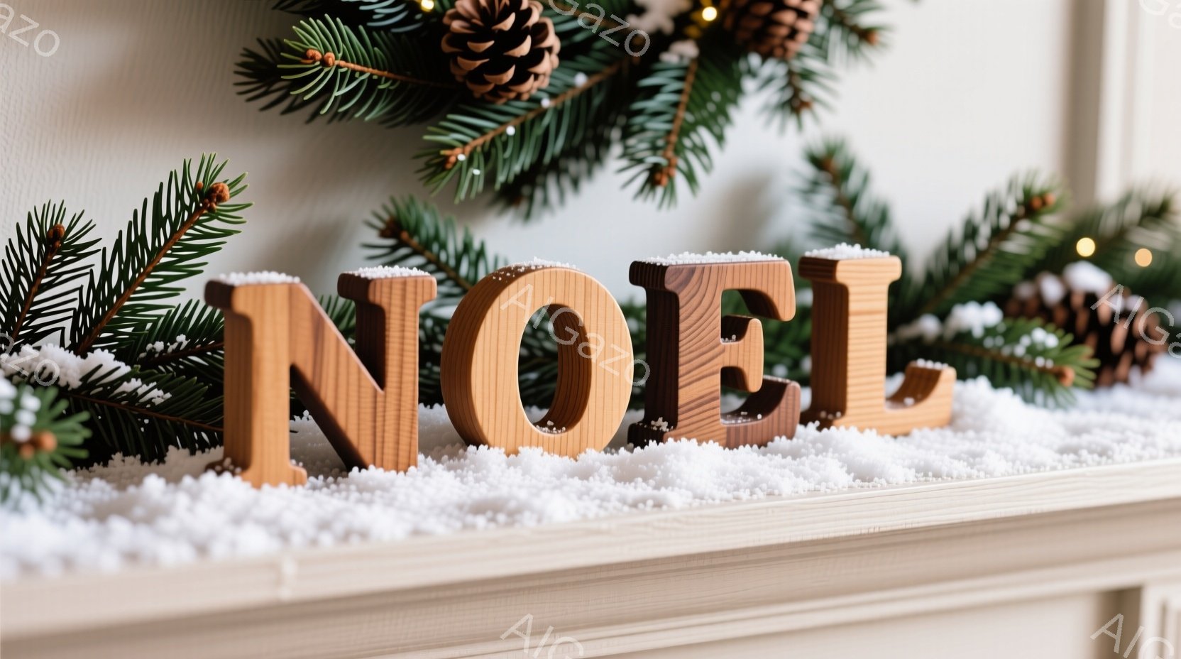 白い棚の上に配置された大きな木製の「NOEL」という文字のクローズアップです。周囲には、松の枝、小さな金色の飾り、そして人工の雪が散りばめられており、クリスマスの雰囲気を醸し出しています。暖色系の木材と緑、金のアクセントが組み合わさり、温かく華やかな印象を与えます。
