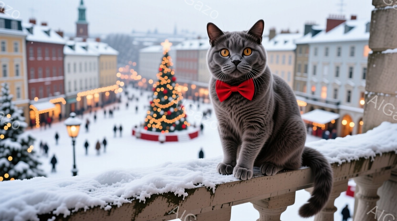 灰色の猫が赤い蝶ネクタイをつけ、雪で覆われたバルコニーの縁に座ってこちらを見ている。背景には、クリスマスツリーや人々がおり、雪が降る冬の街並みが広がる。全体的に、暖かく、お祝いの雰囲気で、猫の表情はどこか余裕のある微笑みをたたえている。