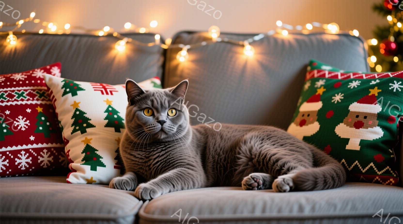 灰色の猫が、クリスマス柄のクッションに挟まれてソファに横たわっています。猫は落ち着いた表情で、前足を揃えてリラックスした姿勢を見せています。背景には、温かみのある光のストリングライトが飾られ、全体的に穏やかで心地よい雰囲気が漂っています。