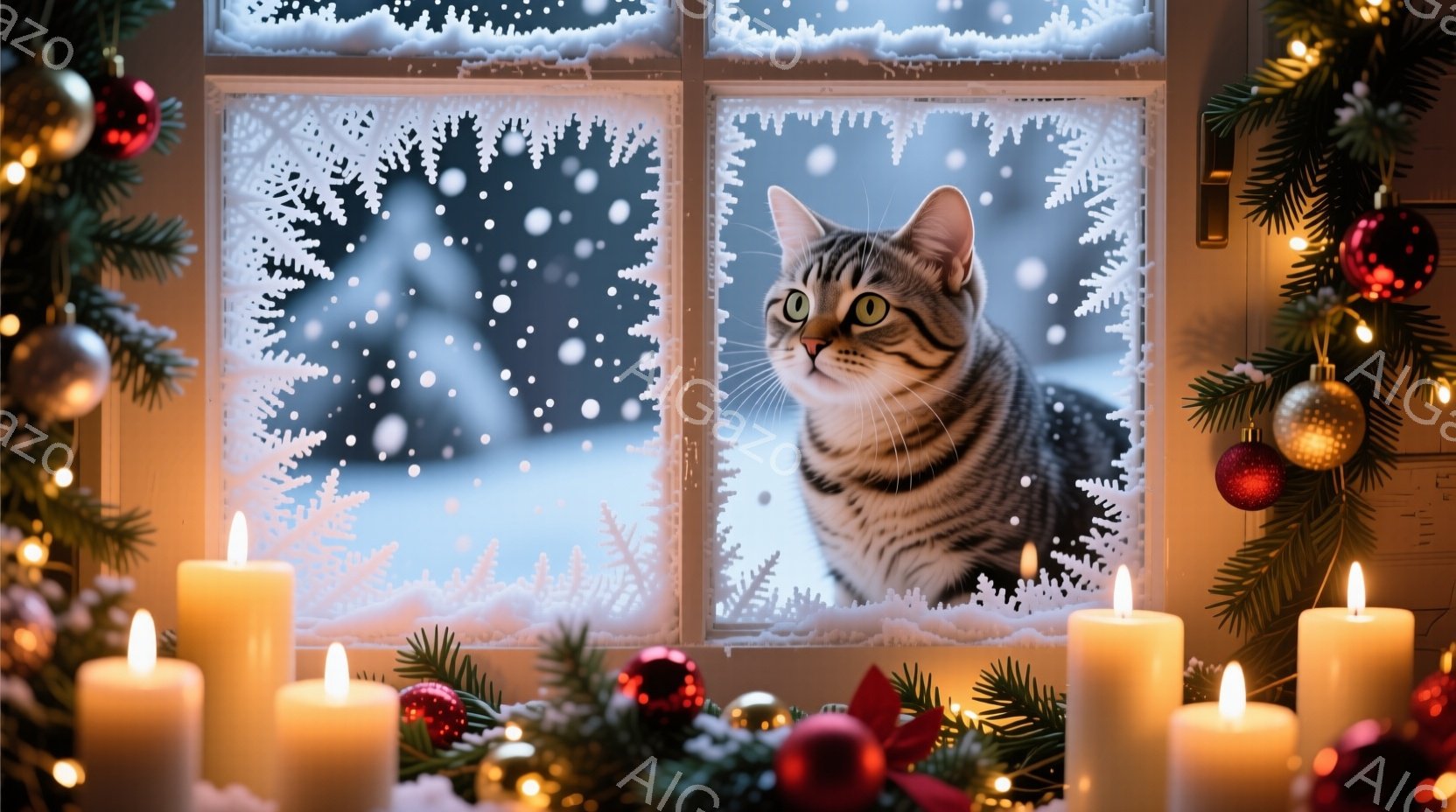 縞模様の猫が窓辺に座り、外を見上げています。窓の外は雪景色で、雪片が舞い散る冬の風景が広がっています。窓辺にはキャンドルやクリスマスツリーの飾りがあり、暖かく穏やかなクリスマスの雰囲気を醸し出しています。
