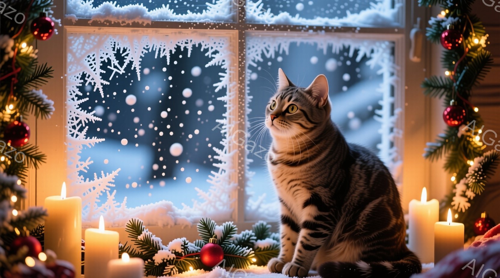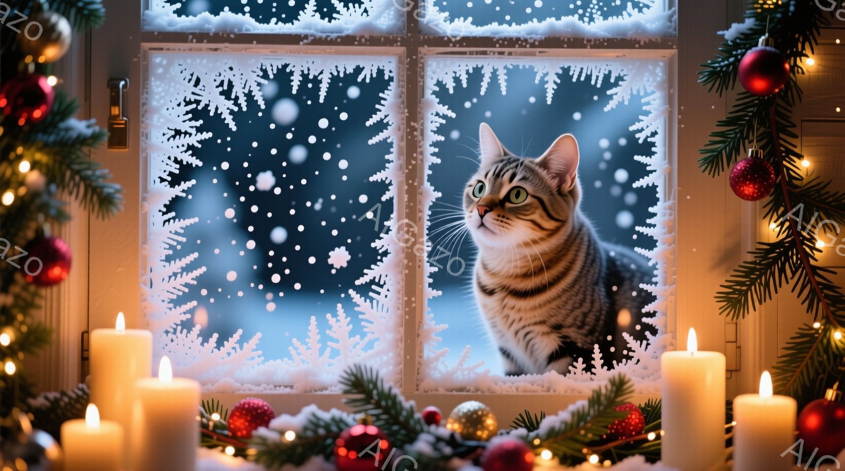 白い窓枠に寄り添う縞模様の猫が、雪の降る外を見つめている。クリスマスツリーの飾りや点けられたキャンドルが暖かく、冬の静かで穏やかな雰囲気を醸し出している。雪景色と室内のもみの木の装飾が、温かくロマンチックなホリデースピリットを表現している。