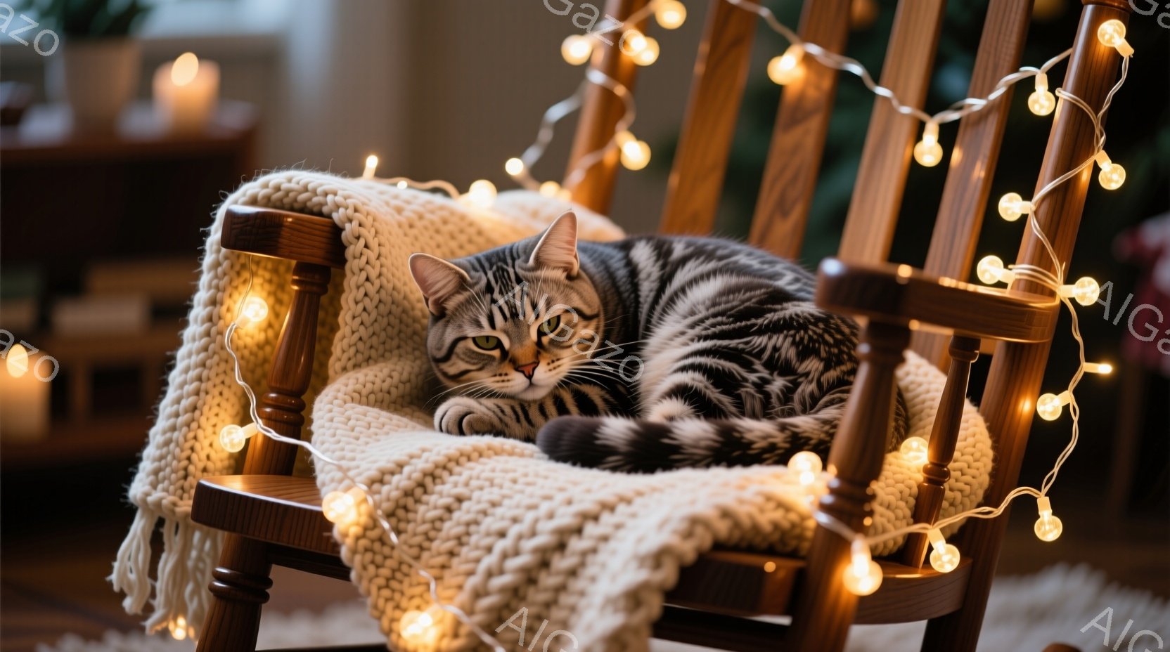 茶色のロッキングチェアに、縞模様の猫が丸まって座っています。猫はリラックスした表情で、穏やかな視線をカメラに向けています。背景にはぼやけたクリスマスツリーと、温かみのある光の装飾が映り込み、居心地の良い冬の雰囲気を醸し出しています。