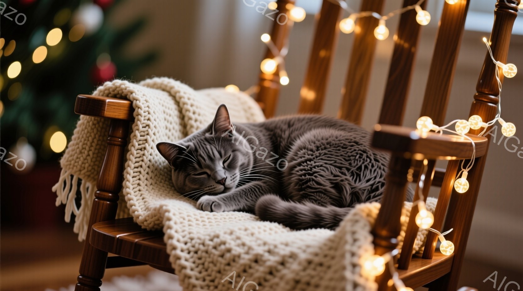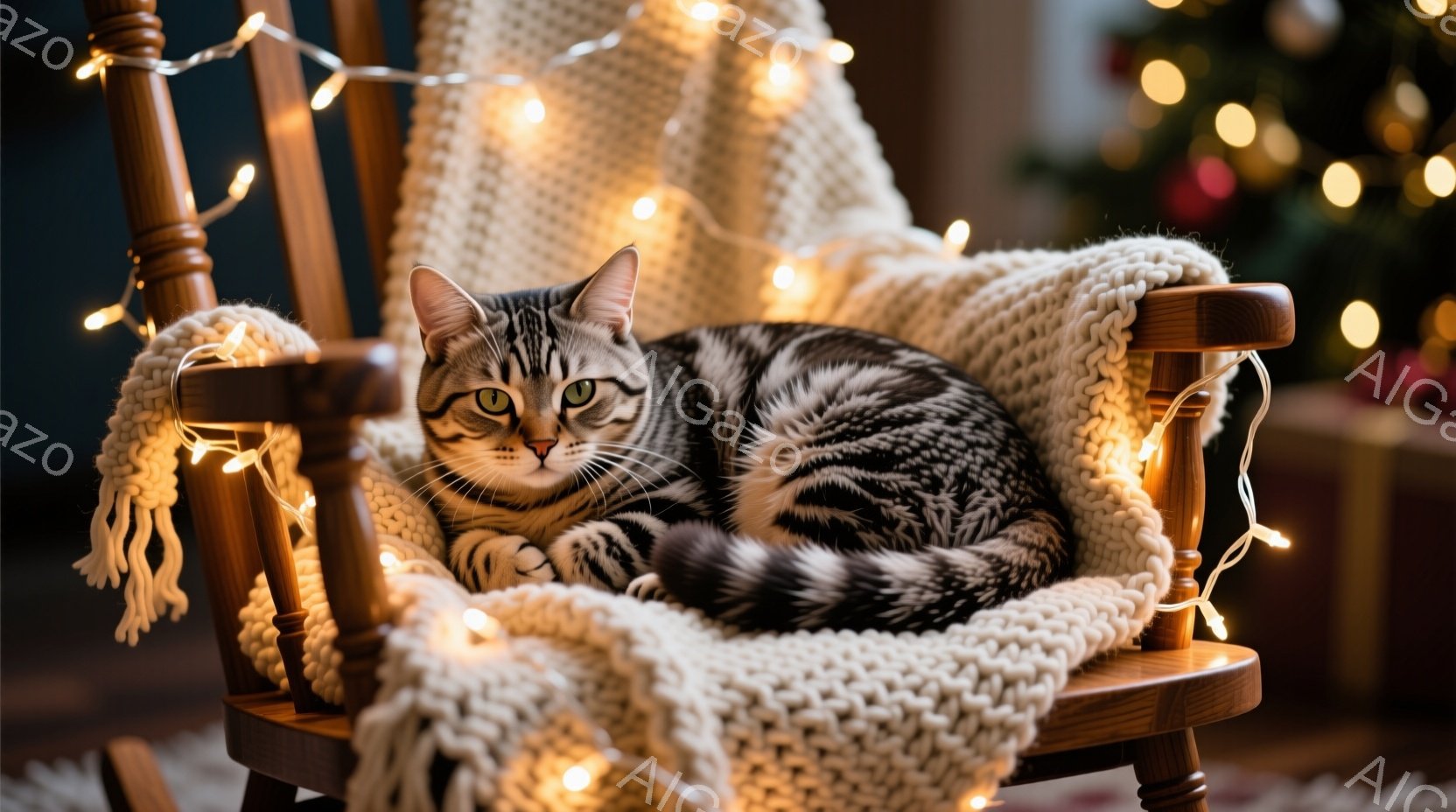 縞模様の猫が、オフホワイトの厚手のニットで覆われたロッキングチェアに丸まって座っています。猫は落ち着いた表情で、リラックスした姿勢を見せており、背景にはぼやけたクリスマスツリーと暖かい色のフェアリーライトが飾られています。全体的に、居心地の良い冬の暖炉のシーンを連想させる、穏やかで心地よい雰囲気です。