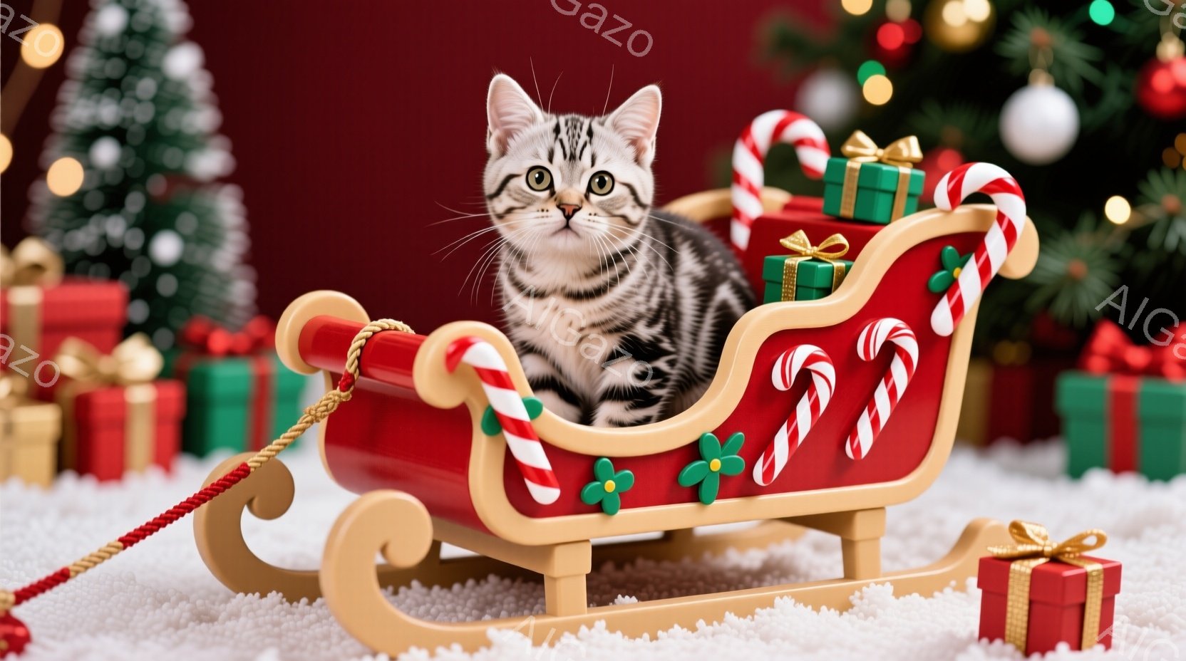 この無料AI生成画像「白と黒の縞模様の小さな子猫が、赤いロープで引かれた木製のそりに座っています。そりには緑色のリボンで飾られたプレゼントがいくつか置かれ、背景にはクリスマスツリーと装飾がぼやけて見えます。全体的に暖かく、お祝いの雰囲気で、クリスマスの季節を感じさせる可愛らしい光景です。」は、2025年10月24日に作成されました。 サイズは 1664×928px の高解像度で、商用利用も可能なフリー素材として提供しています。