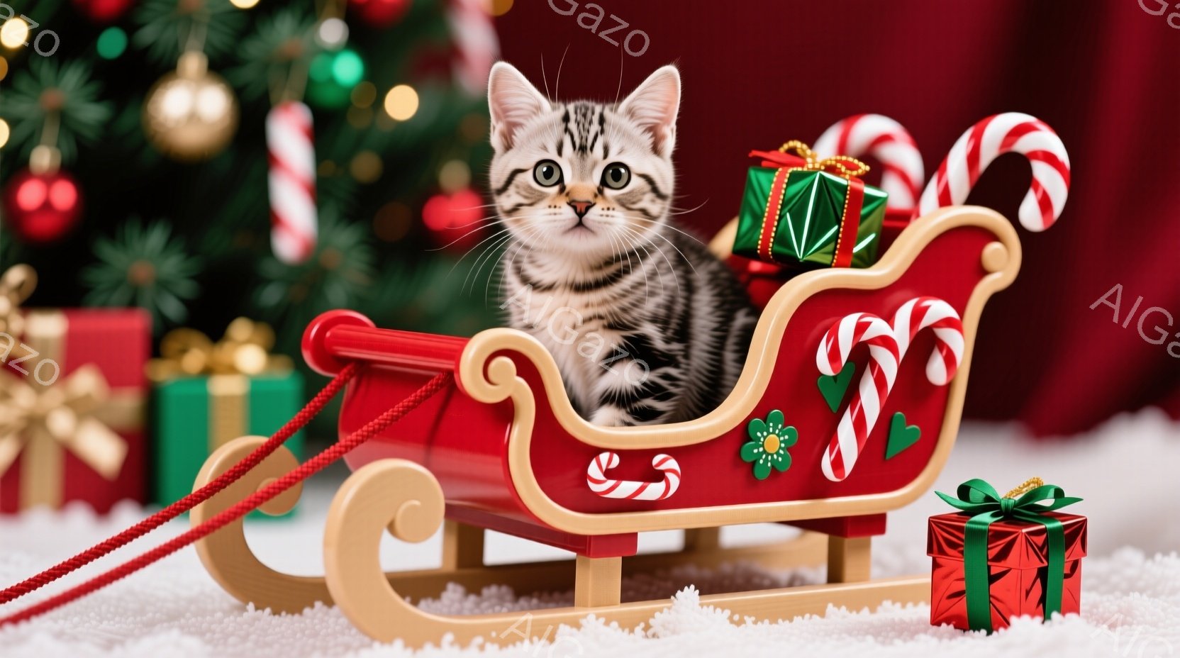 白と黒の縞模様の猫が、クリスマスの飾り付けがされた赤いそりに座っています。そりにはキャンディケーンの装飾と小さなプレゼントが積まれ、猫は好奇心旺盛な表情で正面を見ています。背景には、クリスマスツリーやプレゼントボックスが配置され、雪が積もった床がクリスマスの温かく幻想的な雰囲気を演出しています。