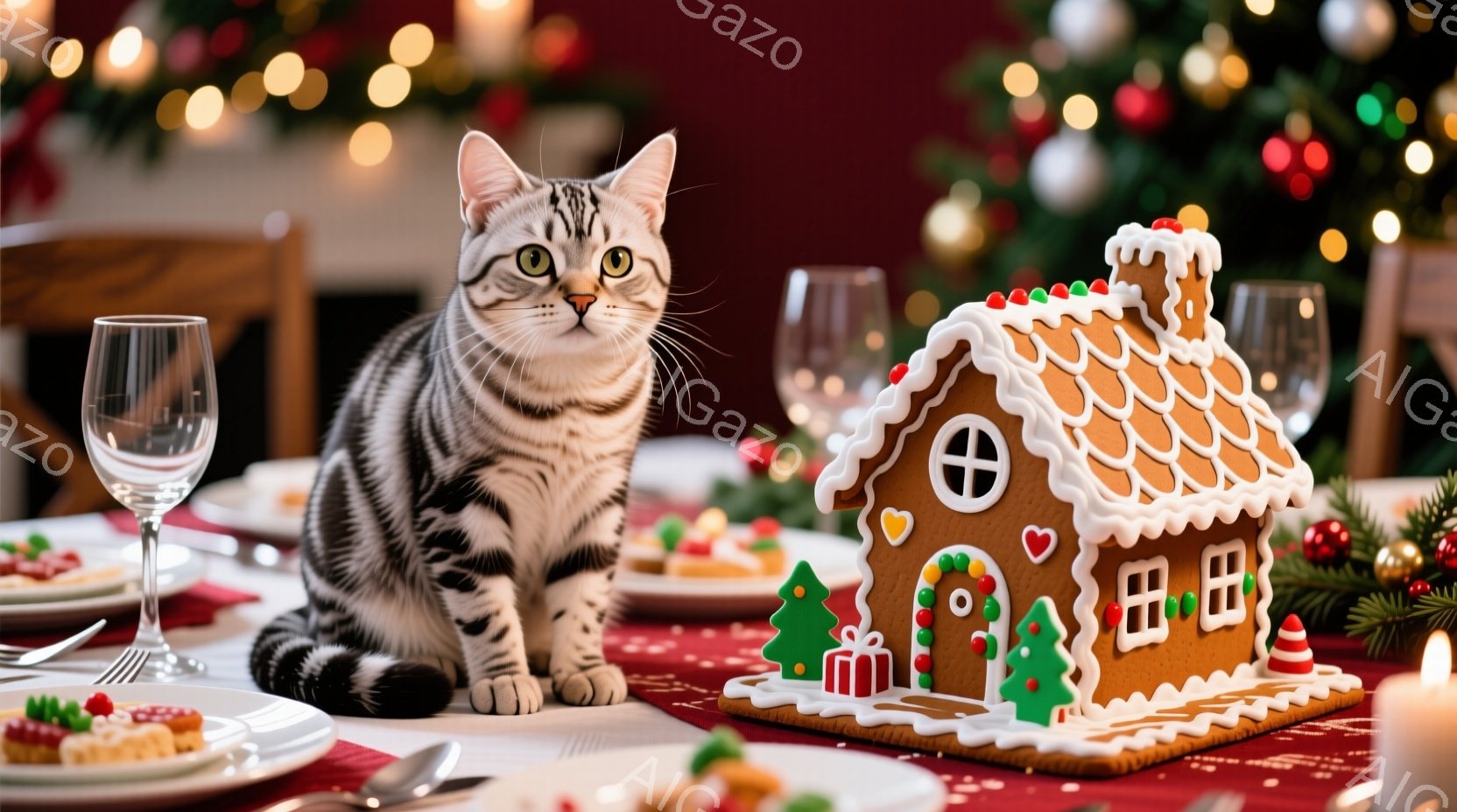 テーブルの上には、クリスマスをテーマにした料理と、精巧に作られたジンジャーブレッドハウスが並んでいる。テーブルの横には、縞模様の猫が座り、興味深そうにジンジャーブレッドハウスを見つめている。背景には、ぼやけたクリスマスツリーと暖色系の照明があり、温かくお祝いの雰囲気を醸し出している。