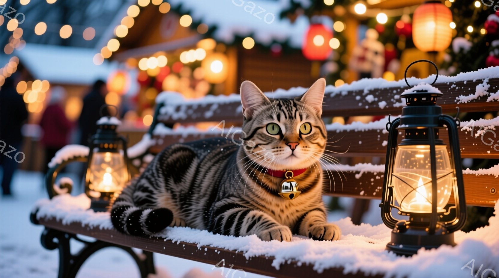 茶色の縞模様の猫が雪の積もったベンチに横たわっています。首輪にはベルが付いており、リラックスした表情でカメラを見つめています。背景には、点灯したランタンとぼやけた建物があり、冬の夜の暖かく幻想的な雰囲気を醸し出しています。