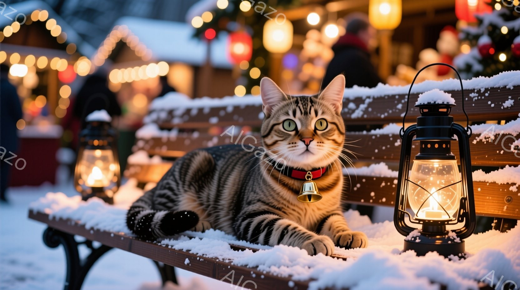 縞模様の猫が雪の積もったベンチに横たわっており、赤い首輪とベルがついています。背景には、点灯したランタンやぼやけた人影、そして雪景色が広がっており、まるで冬の祭りのような雰囲気です。猫はリラックスした表情で、穏やかで暖かな光に包まれています。