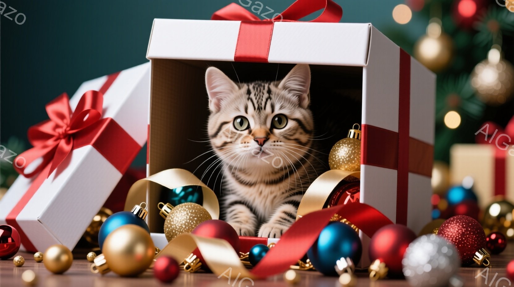 白いギフトボックスの中に、縞模様の猫が丸まって座っています。猫は好奇心と遊び心に満ちた表情でカメラを見つめており、周囲には金や赤のクリスマスオーナメントやリボンが散らばっています。背景はぼかされており、お祝いの雰囲気が漂う、温かく楽しい光景です。