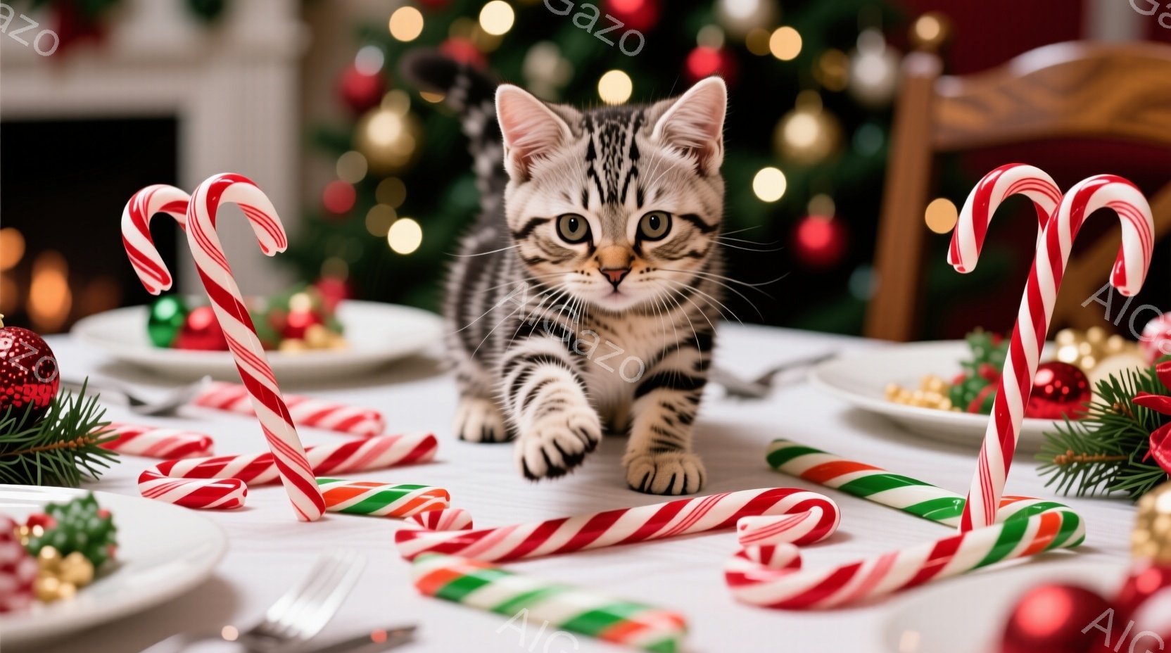 縞模様の猫が、クリスマス装飾で飾られた籐のバスケットにゆったりと横たわっています。赤いリボンとホーリー、そして金と赤のオーナメントが猫を取り囲み、白い毛並みの背景が暖かさを添えています。猫はリラックスした表情で、穏やかで心地よい雰囲気を醸し出しています。