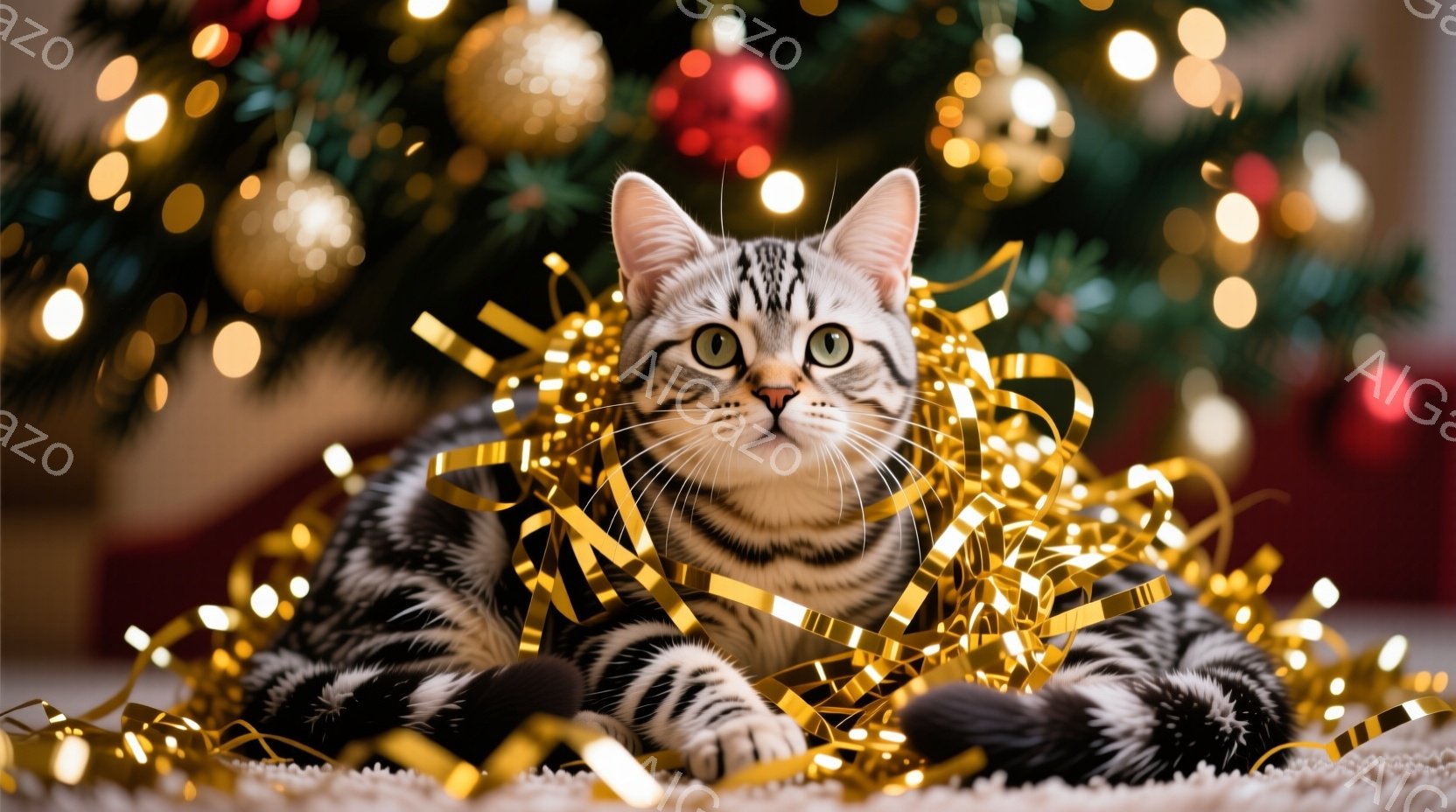 白と黒の縞模様の猫が、金色のリボンに囲まれて床に横たわっています。猫は前足を伸ばし、緑色の瞳でカメラを見ており、リラックスした表情をしています。背景には、ぼやけたクリスマスツリーとプレゼントが見え、華やかで温かい雰囲気を醸し出しています。