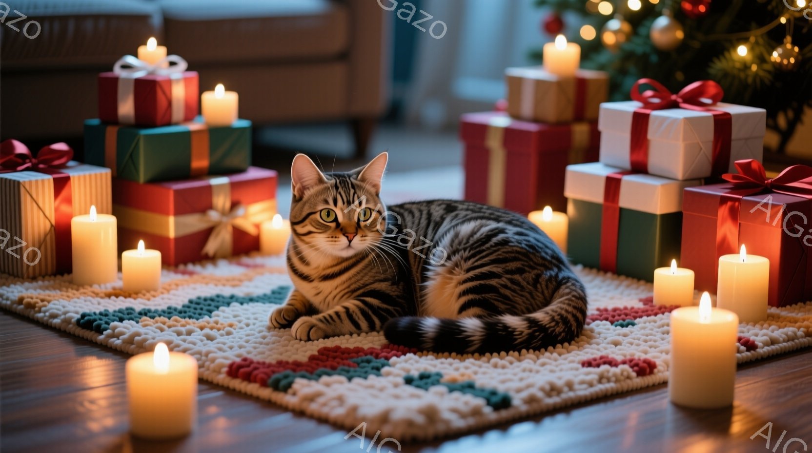 茶色と黒の縞模様の猫が、明るい色の敷物の上でくつろいでいる。猫の周りには、いくつかの白いロウソクが灯されており、背景にはクリスマスツリーと、赤と緑の包装紙で包まれたプレゼントの山がある。全体的に暖かく、お祝いムードにあふれた、クリスマスの風景である。