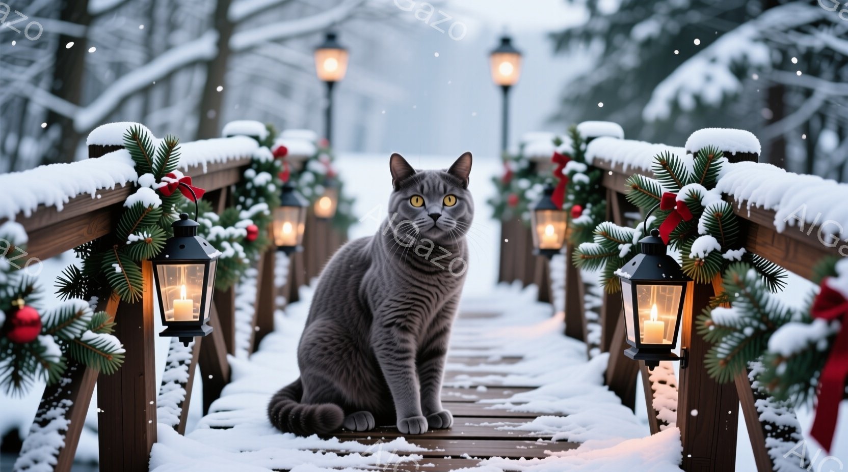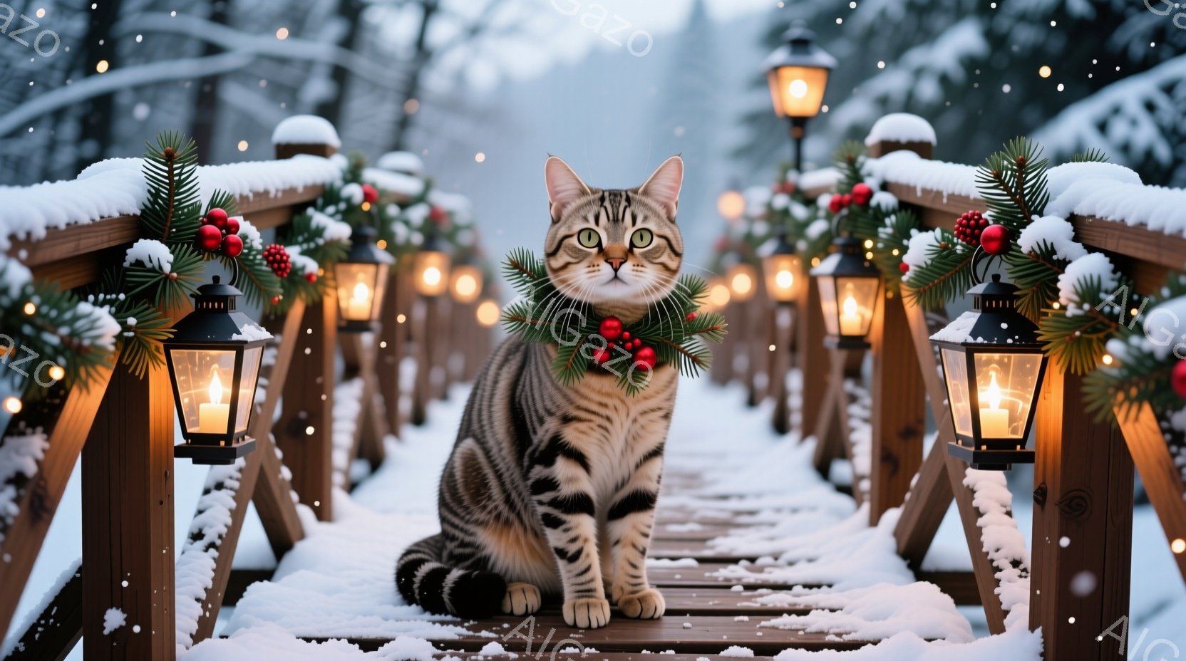 雪に覆われた木製の橋の上に、縞模様の猫が座っています。猫は正面をまっすぐ見つめ、落ち着いた表情をしています。背景には、クリスマスツリーの飾りと点灯したランタンが並び、雪が舞う冬の風景が広がっています。