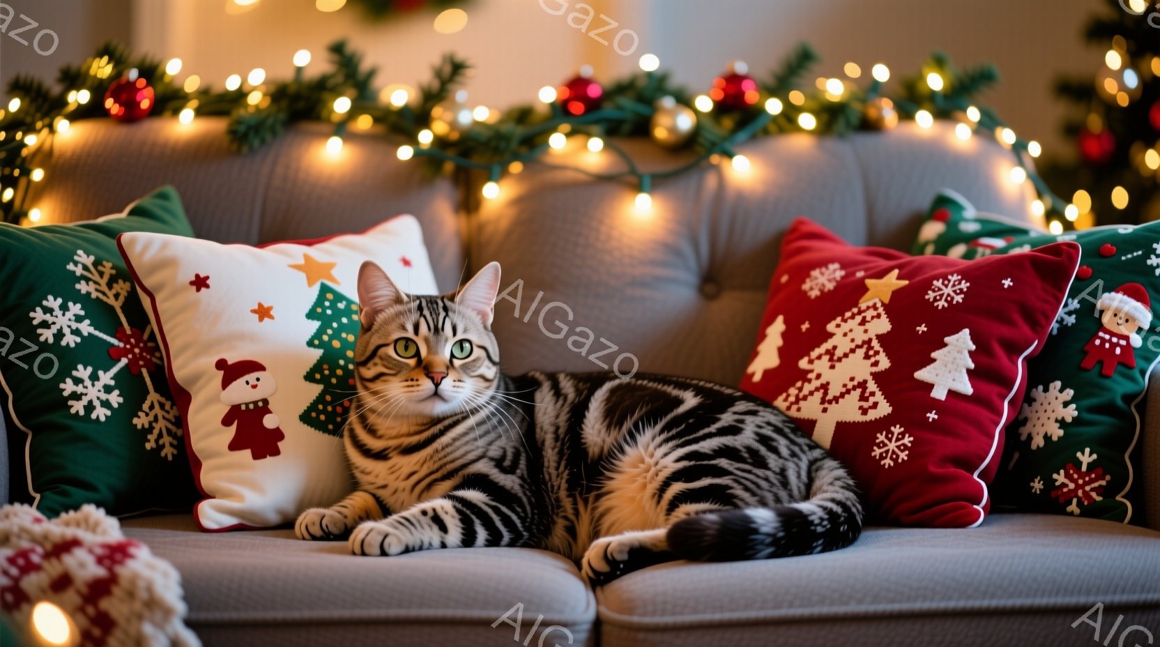 この無料AI生成画像「籐製のバスケットの中に、縞模様の可愛らしい子猫が座っており、周りにはジンジャーブレッドマンやキャンディケーンが散りばめられています。子猫は好奇心旺盛な表情で正面を見つめ、クリスマスの装飾がぼやけて見える背景は暖かく、お祝いの雰囲気を醸し出しています。赤色のリボンがバスケットの正面に結ばれており、全体的に愛らしくて幸せな印象を与えます。」は、2025年10月24日に作成されました。 サイズは 1664×928px の高解像度で、商用利用も可能なフリー素材として提供しています。