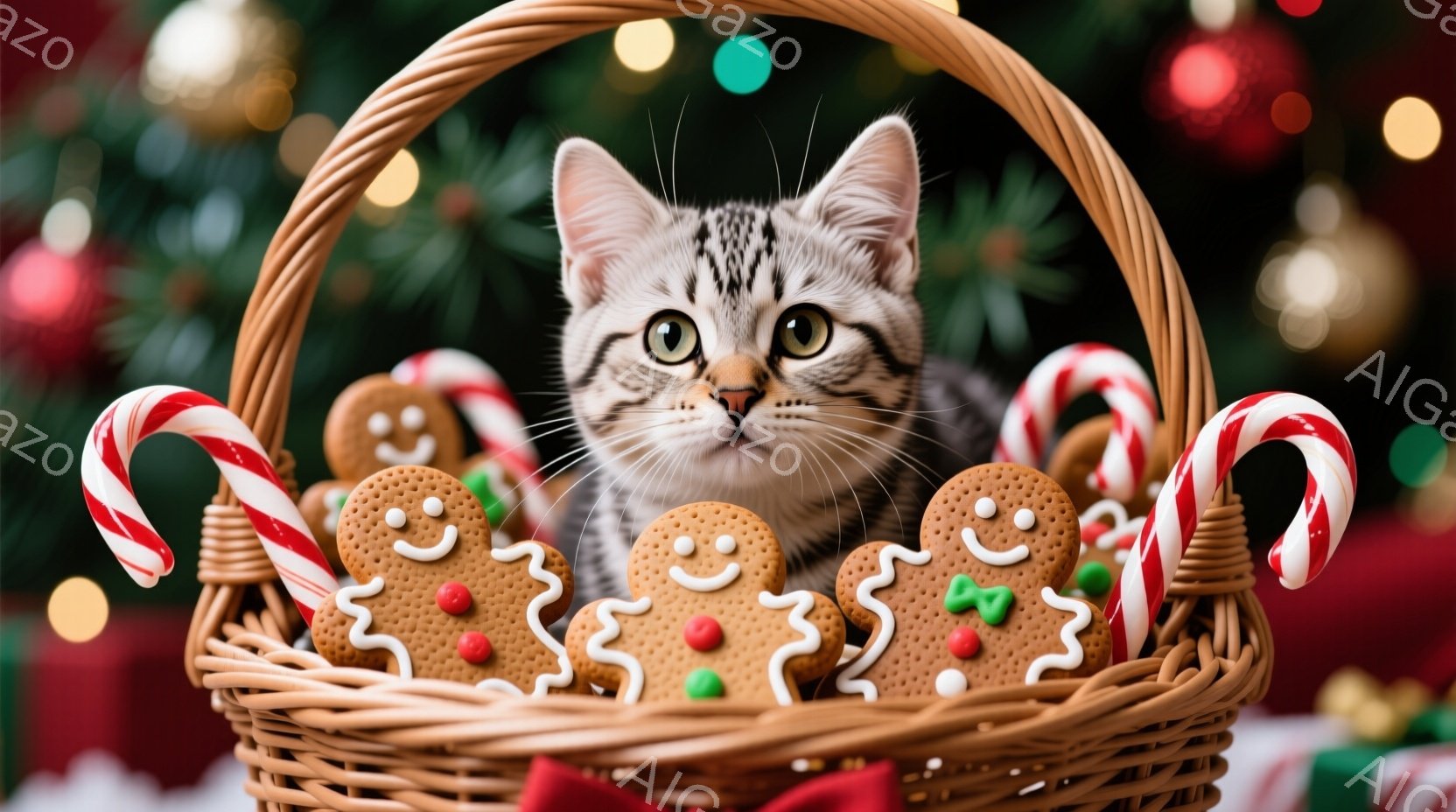 籠の中に、縞模様の小さな子猫が可愛らしく顔を覗かせています。籠の中には、ジンジャーブレッドクッキーやペパーミントキャンディが散りばめられており、クリスマスの装飾が背景にぼやけて見えます。温かく、お祝いの雰囲気が漂う、魅力的な光景です。