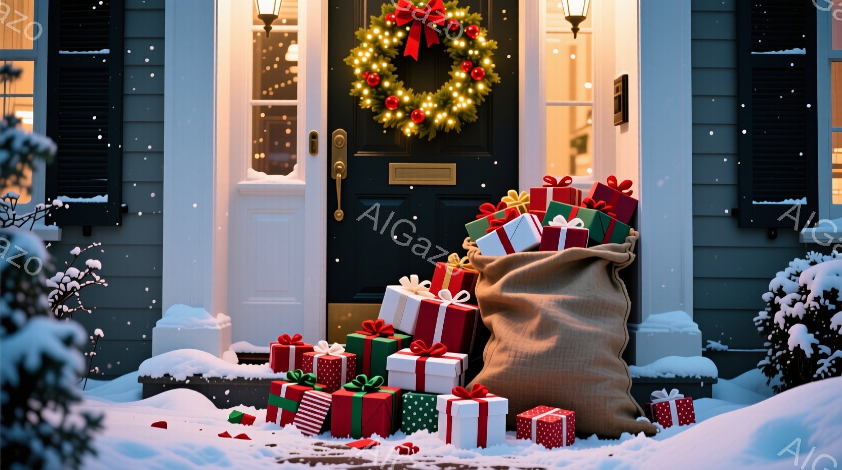 玄関の前に、たくさんのカラフルなプレゼントが散らばっており、キャンバス地の大きな袋が傾いています。背景には雪が降る夜、装飾された玄関ドアと、キラキラと輝くクリスマスライトが添えられています。全体的に、暖かく、お祝いムード満点のクリスマスの雰囲気が漂っています。