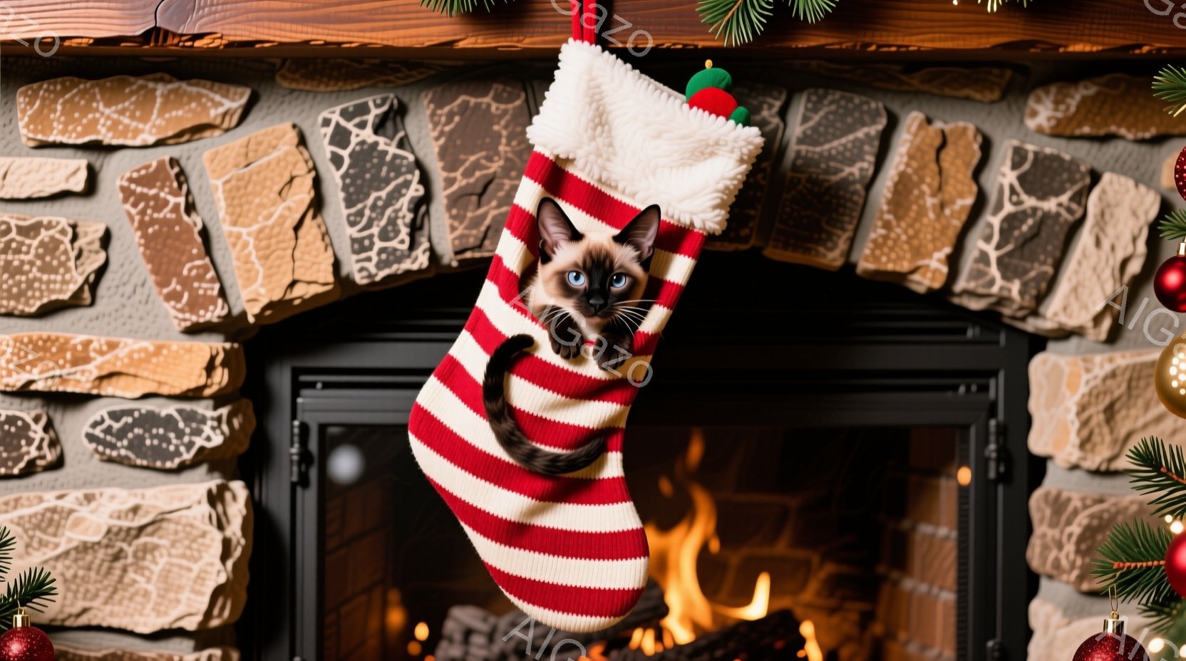 ストライプのクリスマスストッキングの中に、可愛らしいシャム猫が顔を出している。猫は青い瞳でこちらを見つめ、少しいたずらっぽい表情を浮かべている。背景には暖炉があり、炎と装飾がクリスマスの温かく、楽しい雰囲気を醸し出している。