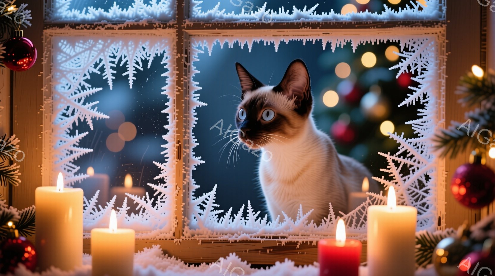 シベリアンハスキーのような毛並みの猫が、雪の結晶模様が描かれた窓枠から外を見つめている。背景には暗い夜空とぼんやりとした光の点があり、窓の周りにはクリスマスツリーの飾りや点灯したキャンドルが配置されている。全体的に暖かく幻想的なクリスマスの雰囲気を醸し出している。