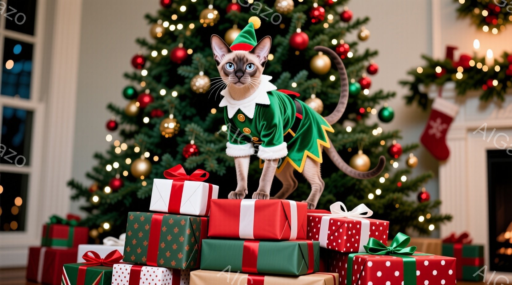 シャム猫がクリスマスプレゼントの山の上に立っており、緑と赤の妖精の衣装を着ています。背景には、オーナメントで飾られたクリスマスツリー、暖炉、そしてお祝いの雰囲気が漂っています。猫は自信に満ちた表情で、まるでプレゼントを警備しているかのようなポーズをとっています。