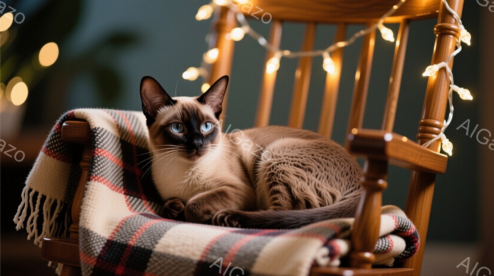 シーラムカラーの猫が、チェック柄のブランケットが敷かれたロッキングチェアにゆったりと横たわっている。その表情は穏やかで、青い瞳がカメラを見つめている。背景にはぼやけた光が灯り、温かくリラックスした雰囲気を醸し出している。
