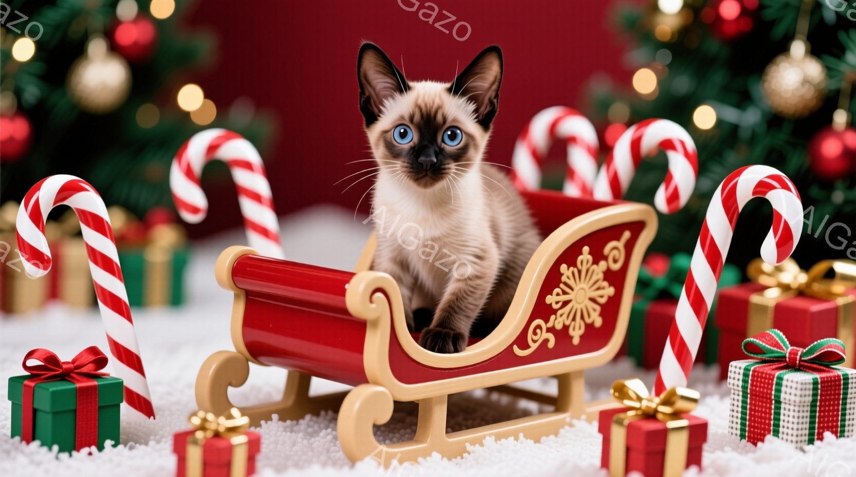 白い雪の上に赤いそりが置かれており、その中に子猫が座っています。子猫はシャム猫で、青い瞳と明るい表情で、後ろ足に力を入れて座っています。背景にはクリスマスツリーとプレゼントの箱が散りばめられており、全体的に温かく、お祝いムードに満ちた雰囲気です。